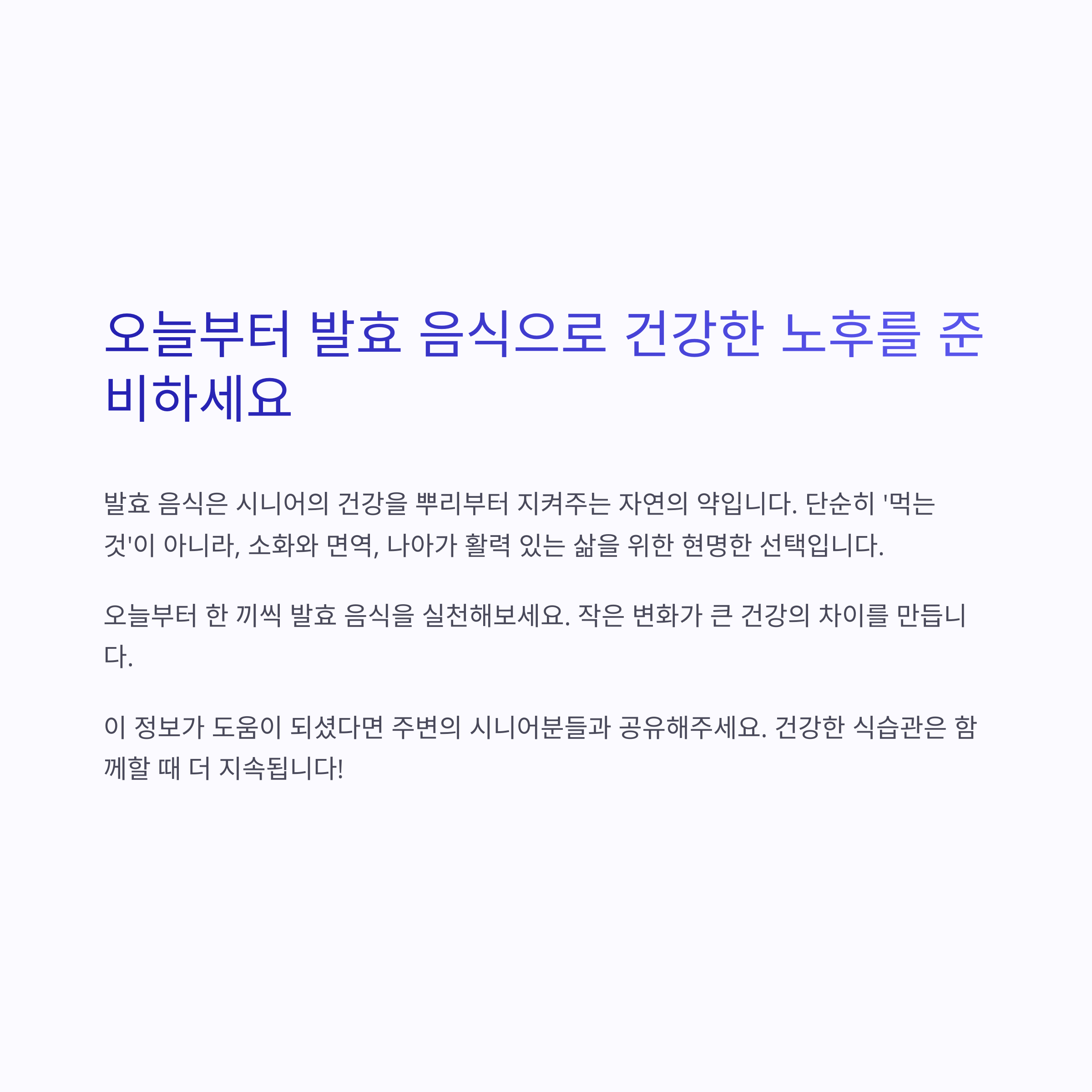 발효 음식은 시니어의 건강을 뿌리부터 지켜주는 자연의 약입니다. 단순히 ‘먹는 것’이 아니라, 소화와 면역, 나아가 활력 있는 삶을 위한 선택입니다. 오늘부터 한 끼씩 발효 음식을 실천해보세요.