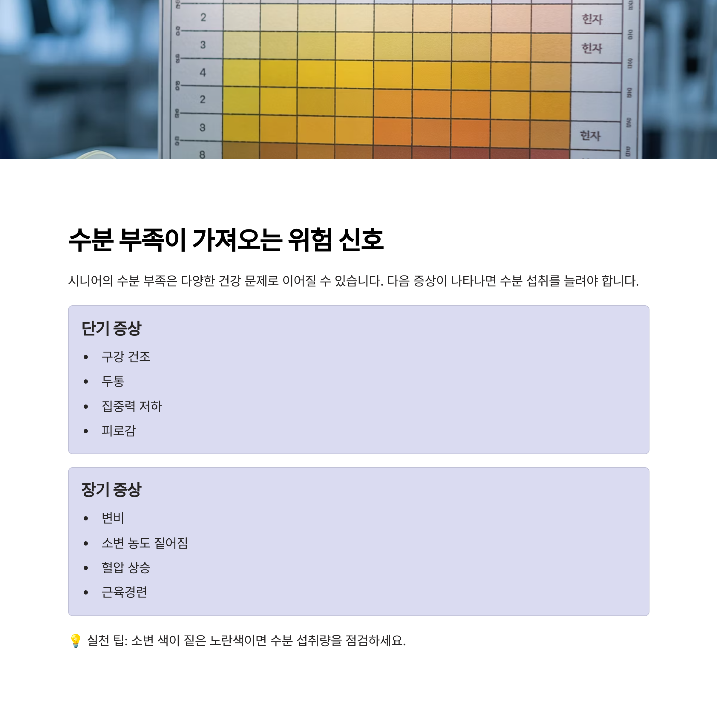 물은 가장 쉬운 건강 비결입니다. 의식적으로 물을 마시는 습관은 시니어의 활력을 지켜주는 기본입니다. 오늘부터 한 모금씩, 건강한 수분 루틴을 만들어보세요.