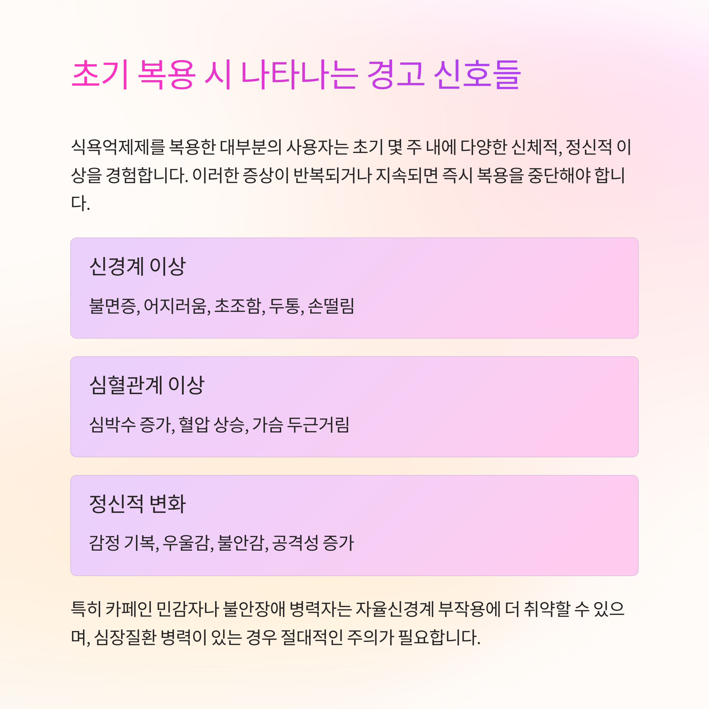 | 심혈관계 이상 | 심박수 증가, 혈압 상승, 가슴 두근거림 |