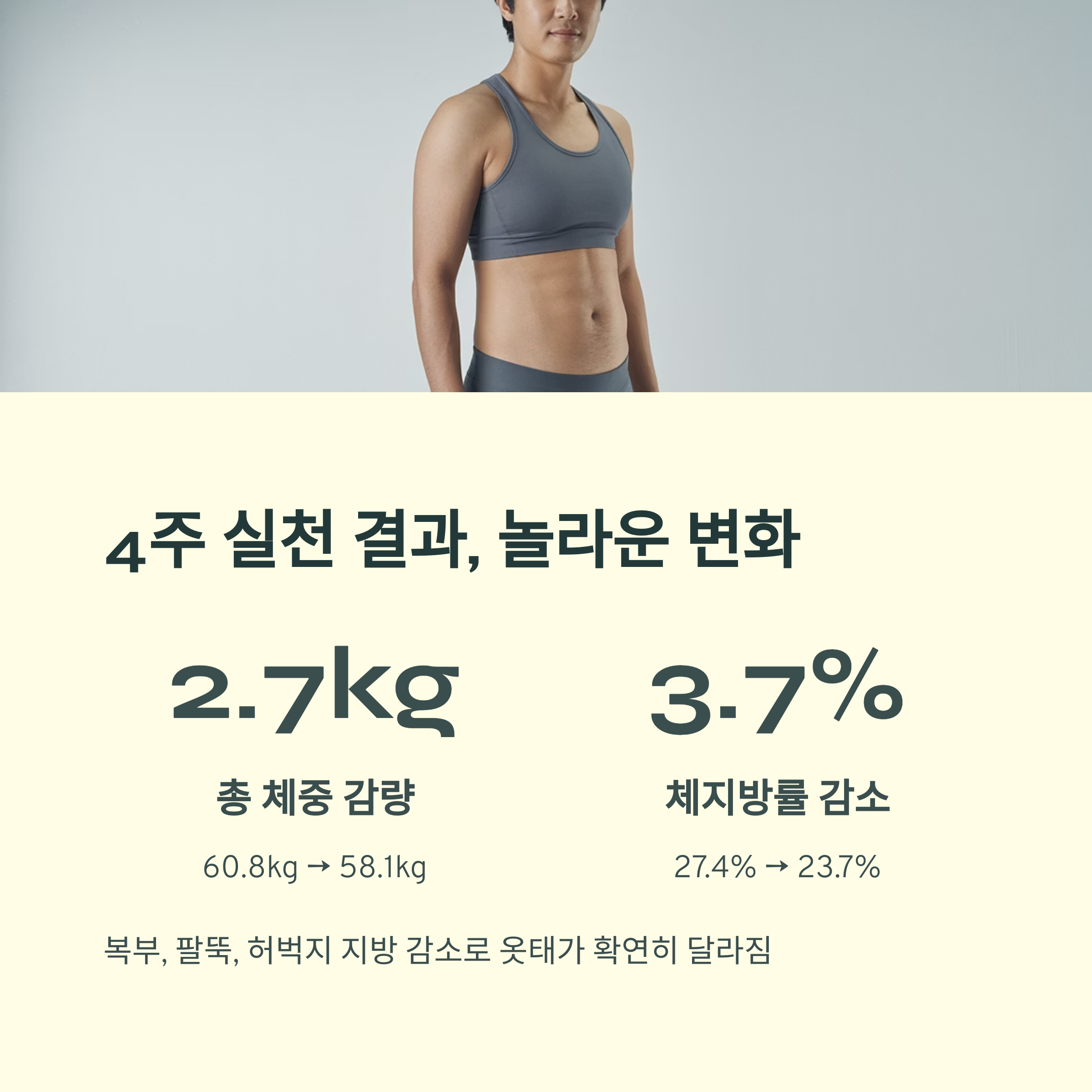 공복운동을 4주간 이어가면서 체중은 총 2.7kg 정도 줄었고, 가장 눈에 띄는 변화는 체지방률의 감소였습니다. 특히 복부와 팔뚝, 허벅지 주변의 지방이 조금씩 줄어들면서 옷태가 확연히 달라졌습니다.