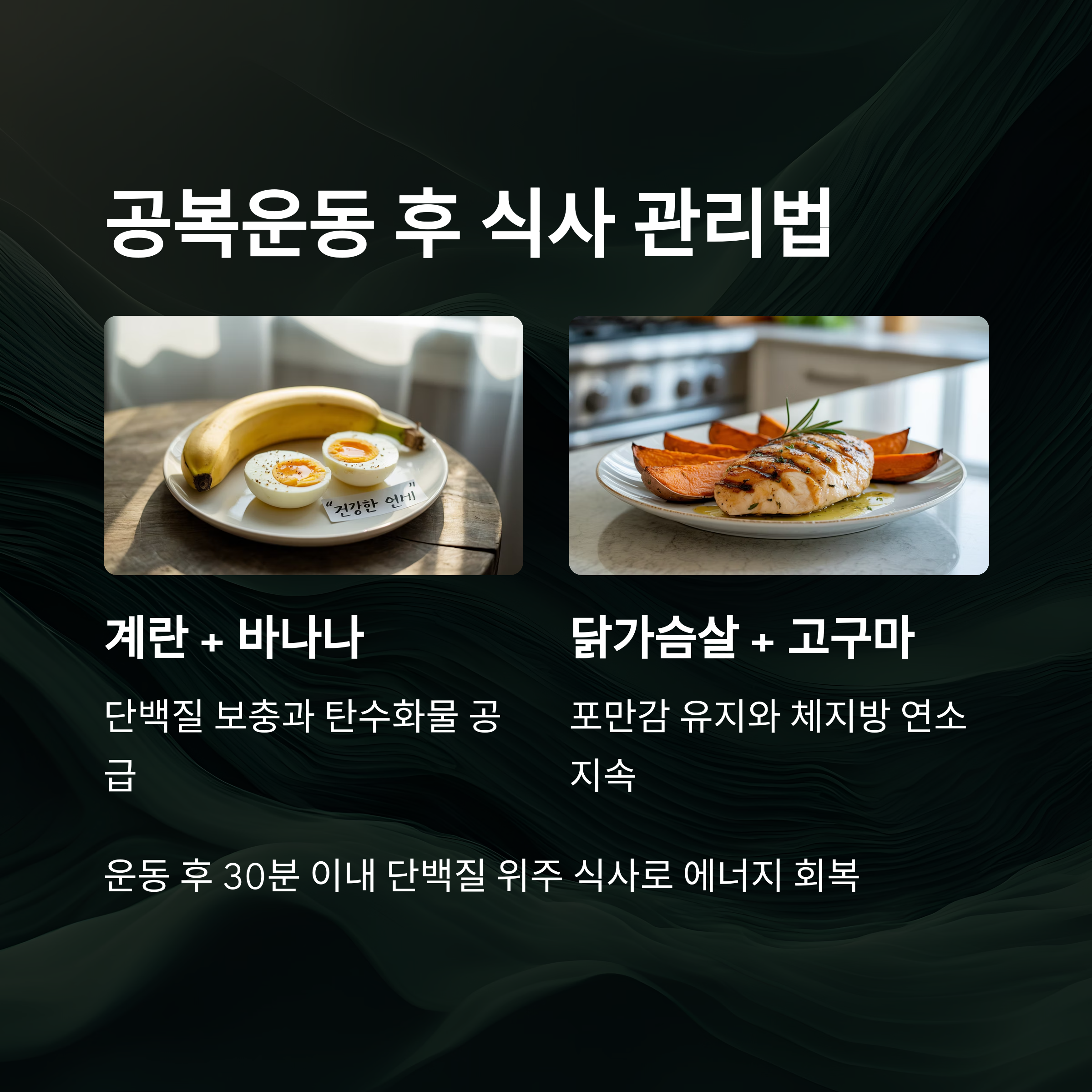 | 삶은 계란 + 바나나 | 단백질 보충 + 탄수화물 공급 |
