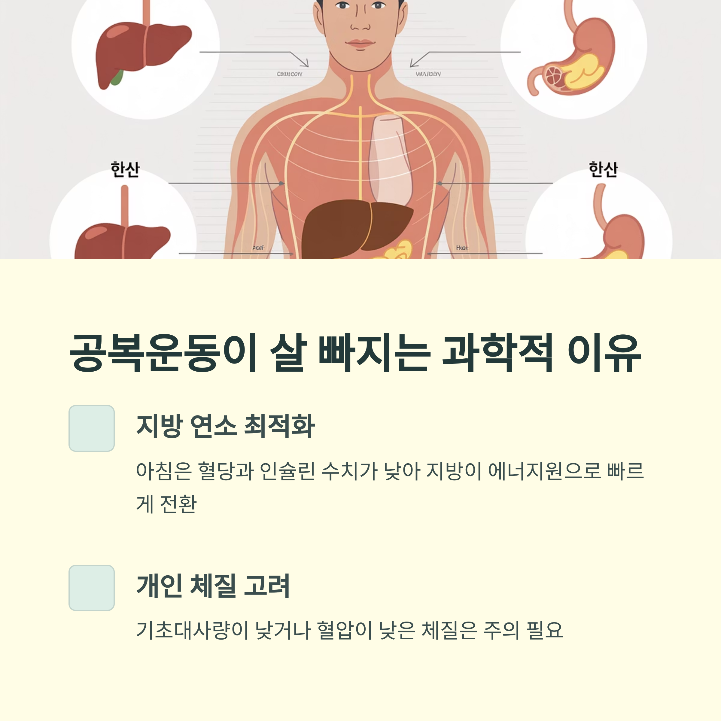 하지만 무조건 공복 운동이 좋다는 건 아닙니다. 기초대사량이 낮거나 아침에 혈압이 떨어지는 체질이라면 오히려 무리가 될 수 있으므로, 반드시 개인 컨디션을 체크하고 시작하는 것이 중요합니다.