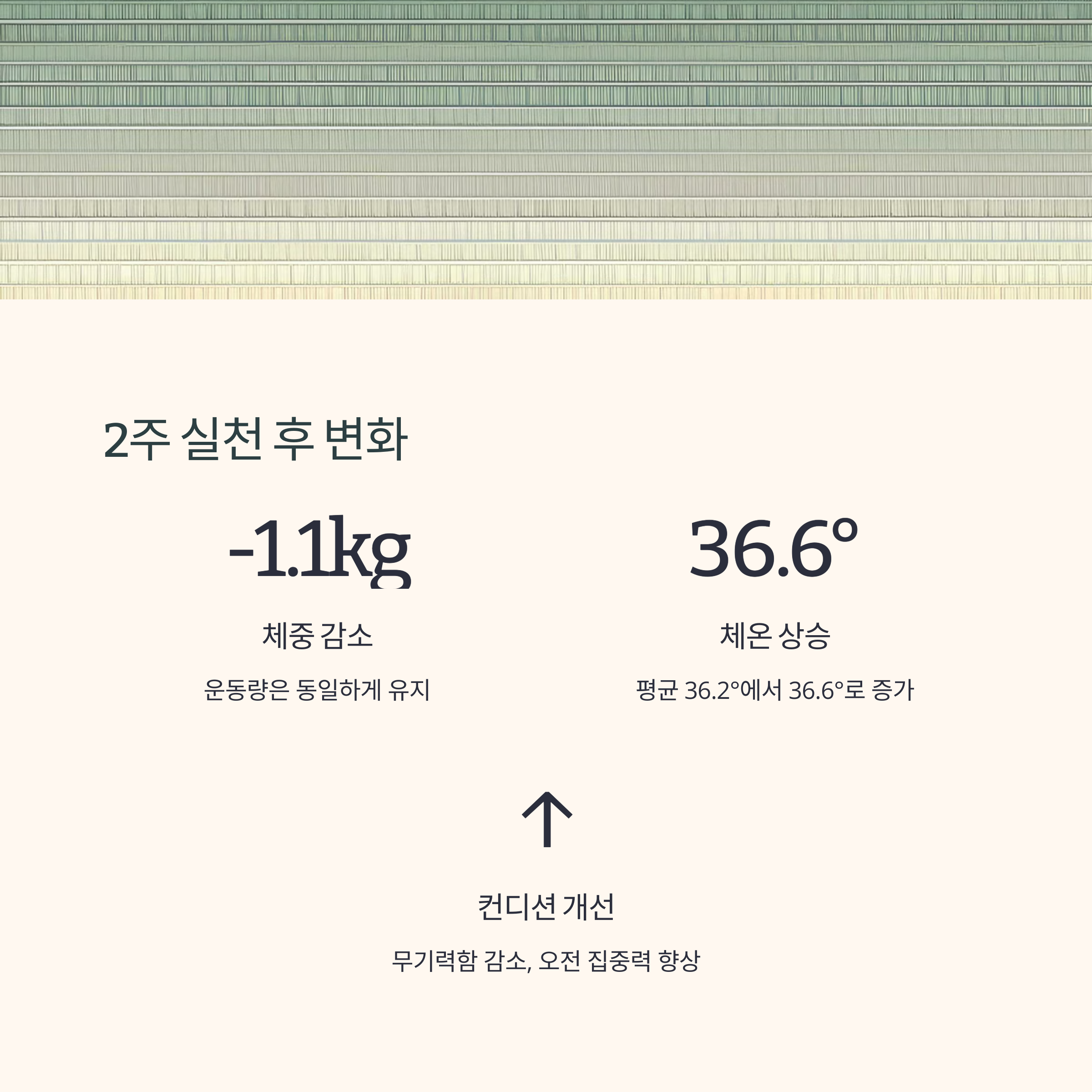이 루틴을 2주만 유지해도 아침 체온이 0.20.4도 상승하고,기초대사량이 평균 50100kcal 증가한 사례가 많습니다.
