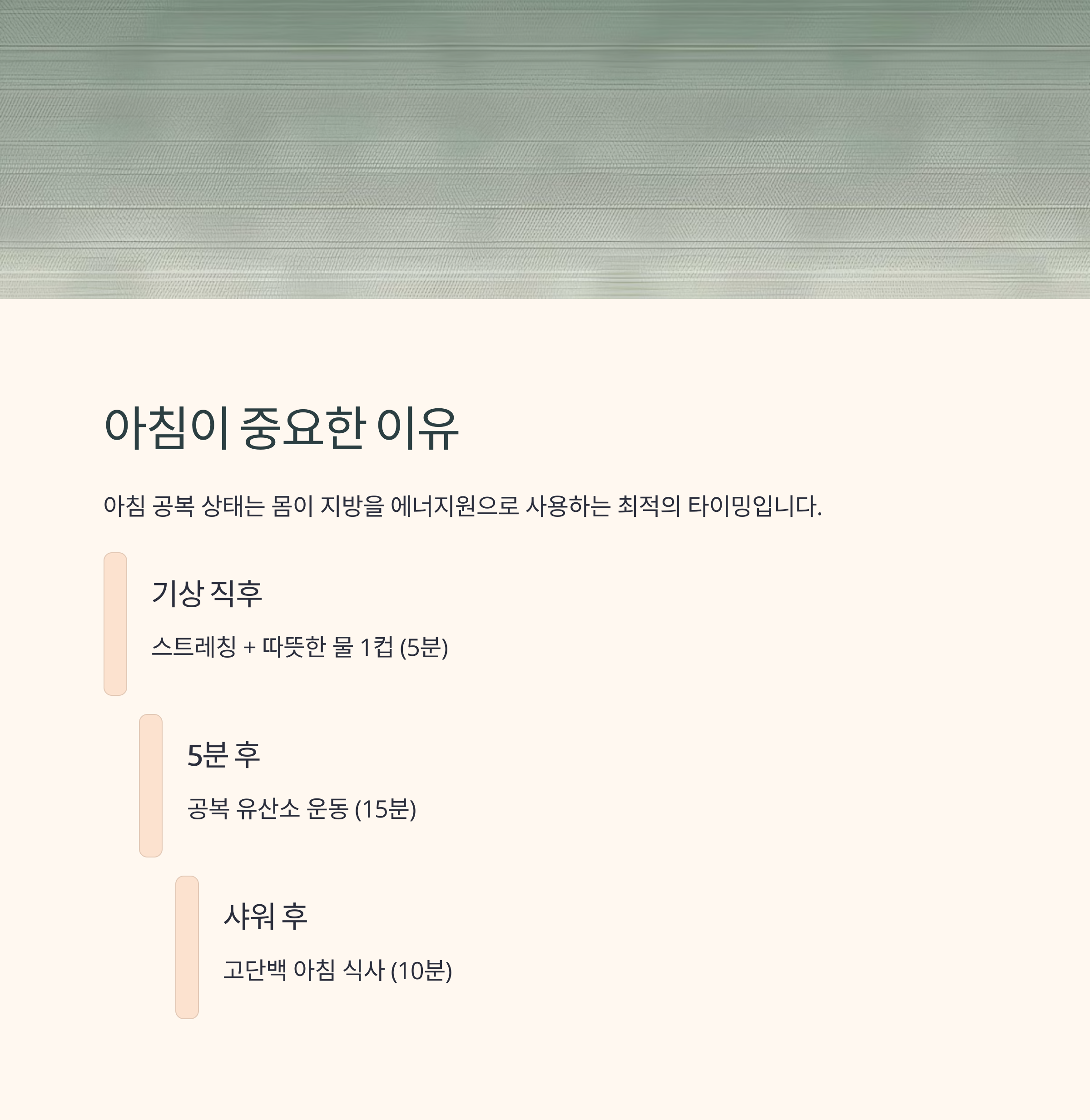 | 5분 후 | 공복 유산소 (걷기, 계단 오르기 등) | 약 15분 |