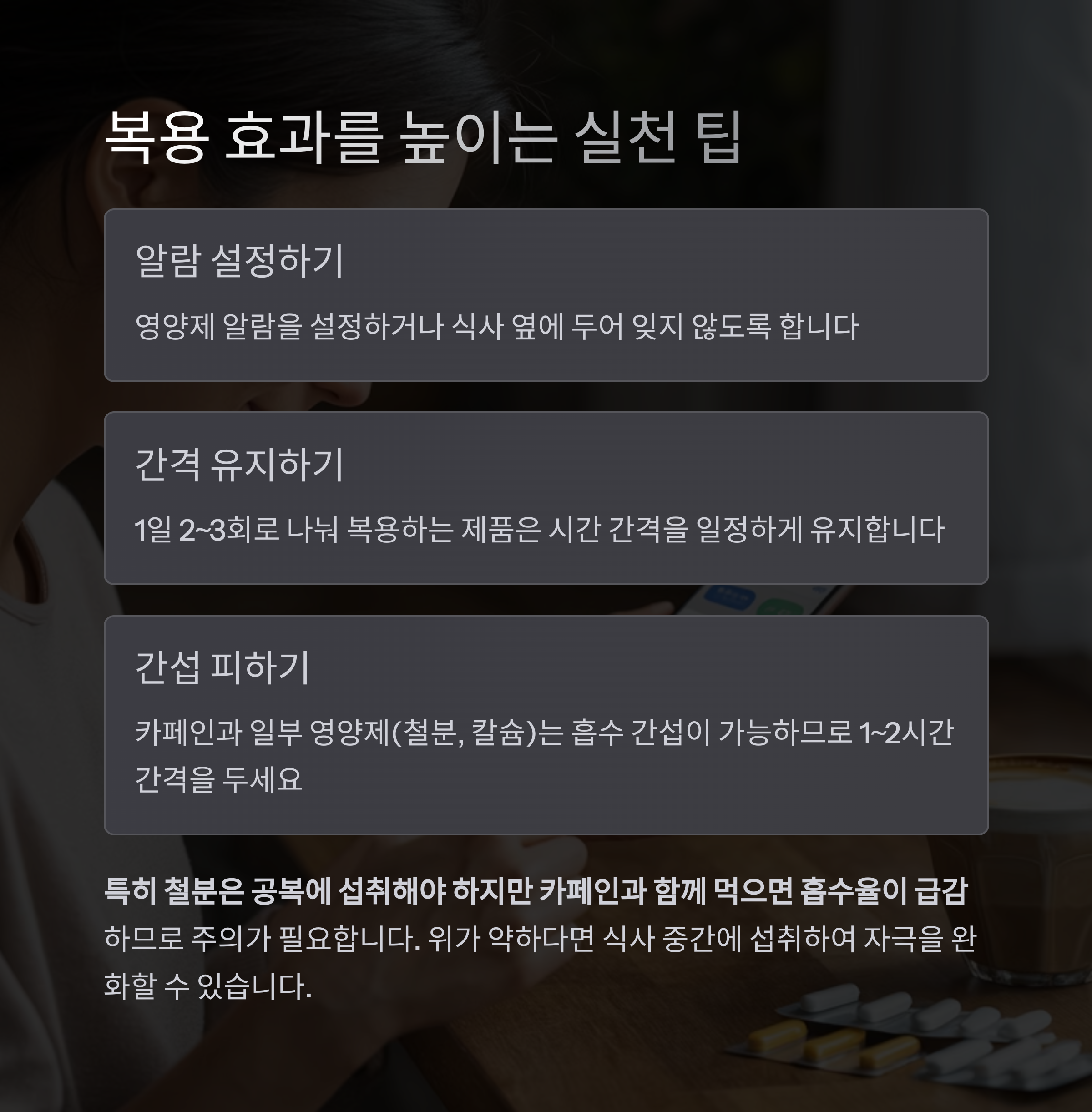 - 카페인과 일부 영양제(철분, 칼슘)는 흡수 간섭 가능 → 간격 조절