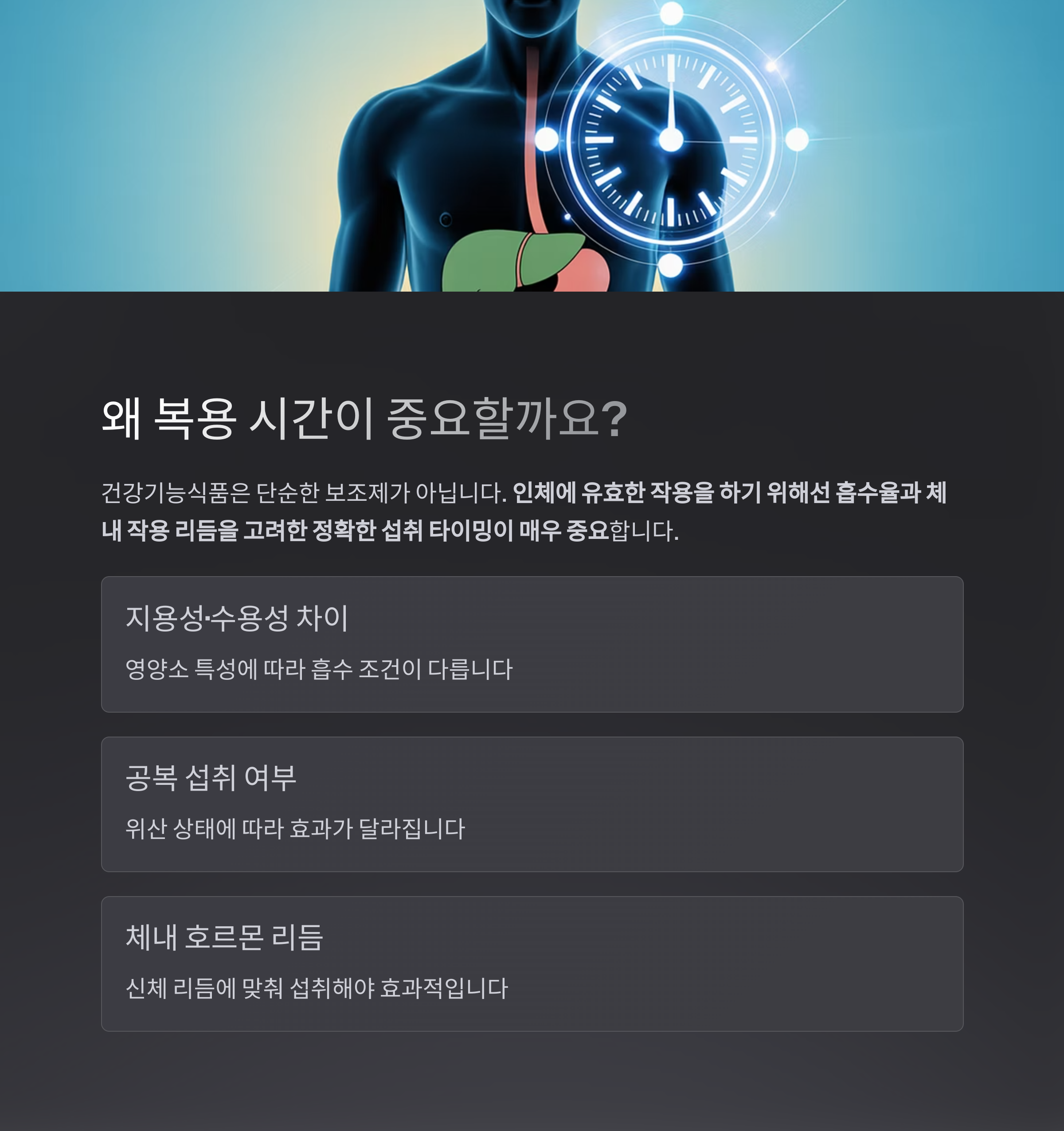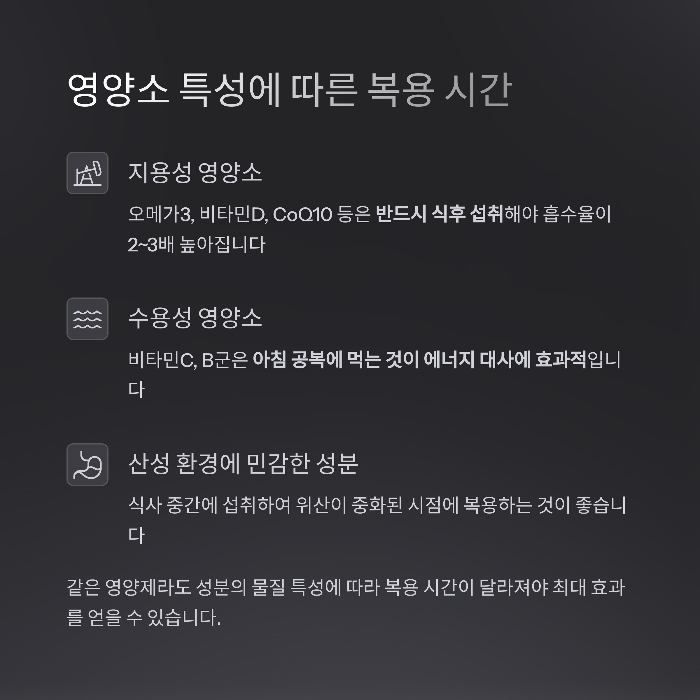 같은 영양제라도, 언제 먹느냐에 따라 흡수율과 작용 효과가 달라집니다