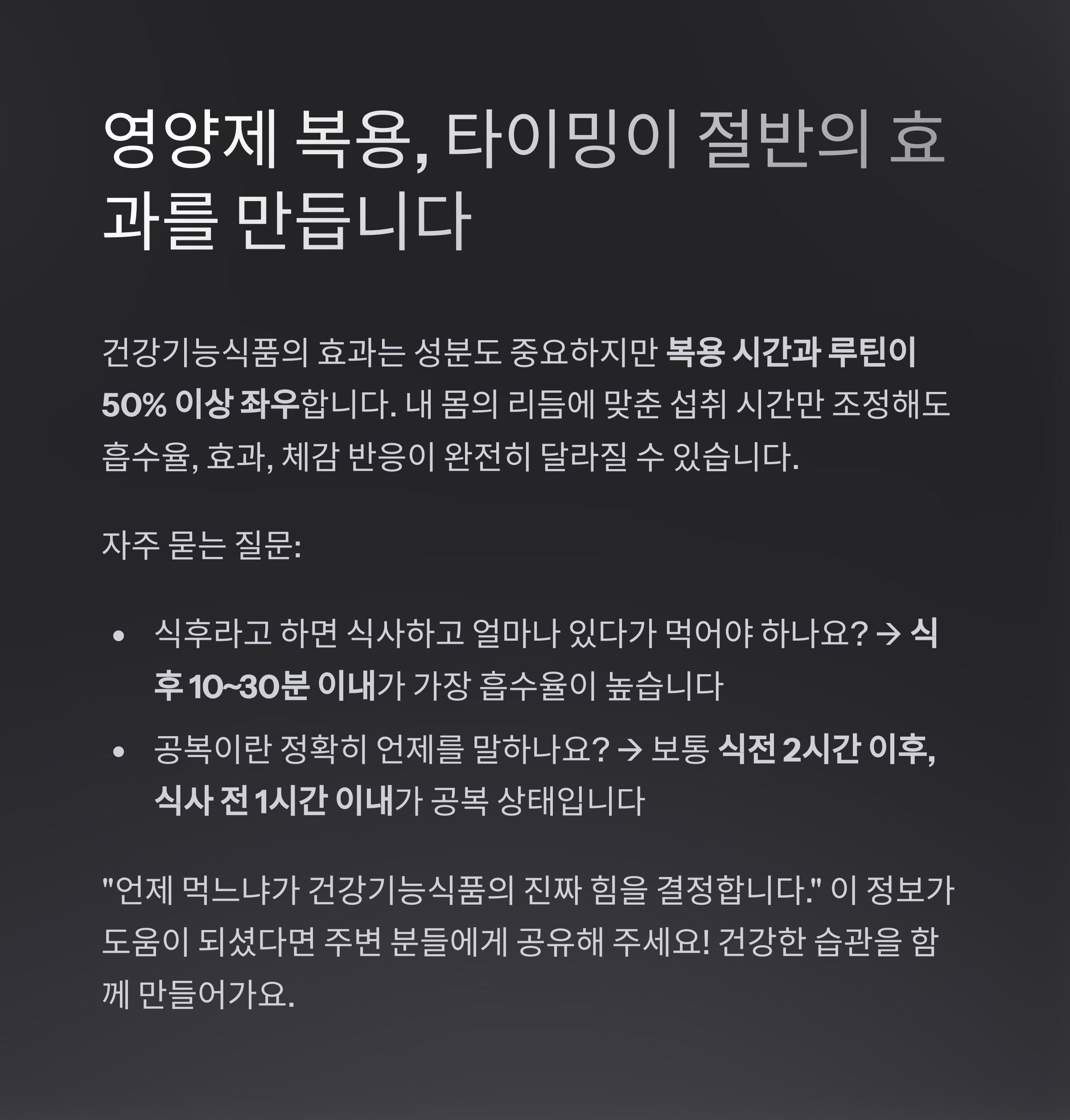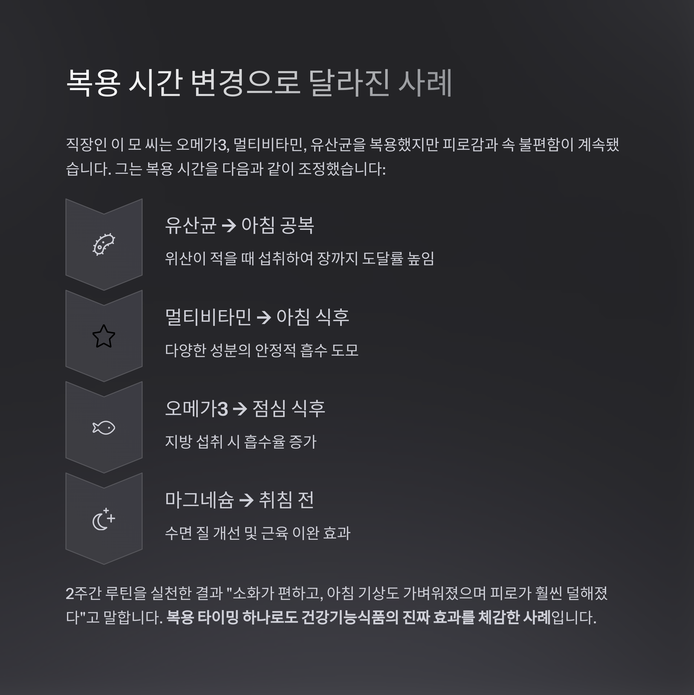 복용 타이밍 하나로도 건강기능식품의 진짜 효과를 체감한 사례입니다