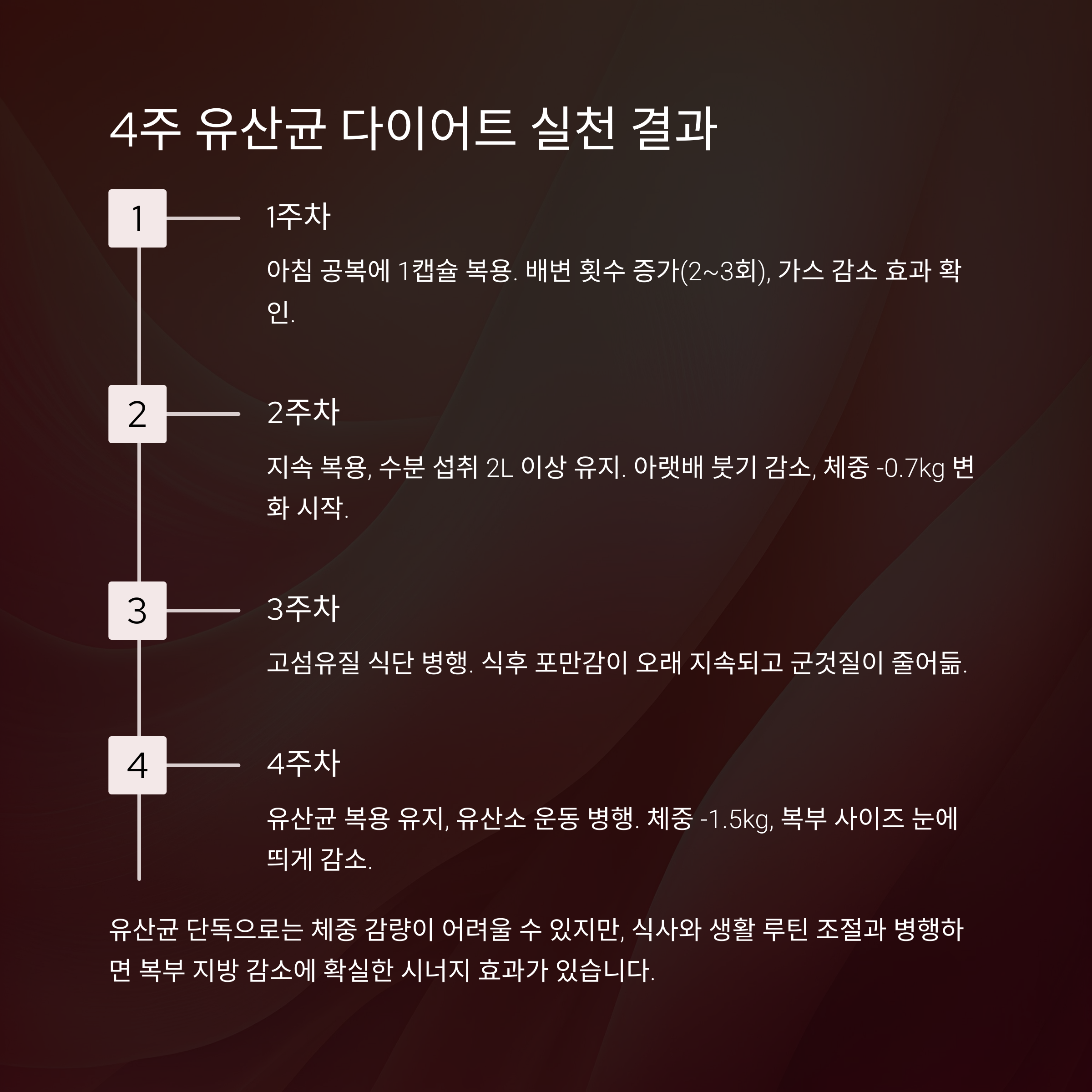 | 4주차 | 유산균 복용 유지, 유산소 운동 병행 | 체중 -1.5kg, 복부 사이즈 눈에 띄게 줄어듦 |