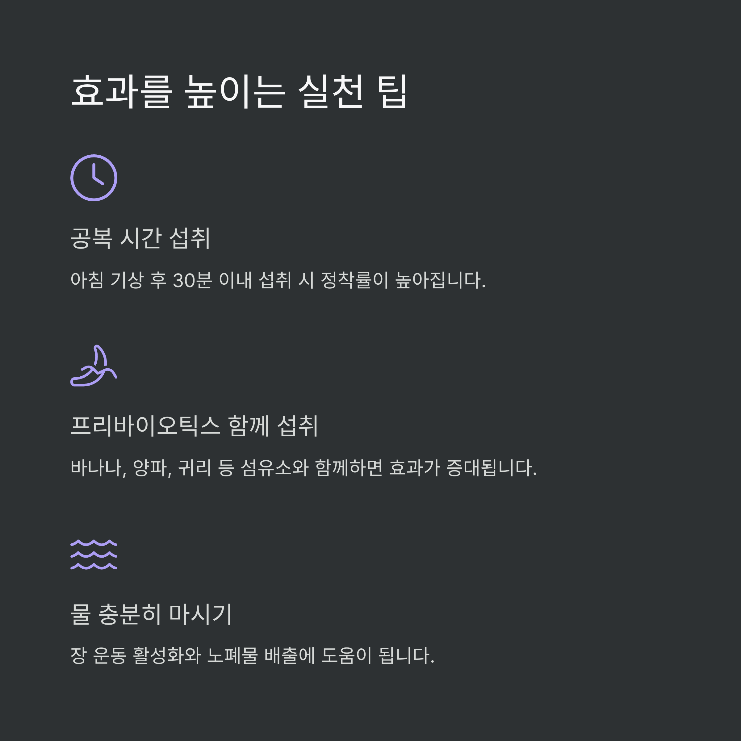 | 공복 시간 섭취 | 아침 기상 후 30분 이내 섭취 시 정착률 상승 |