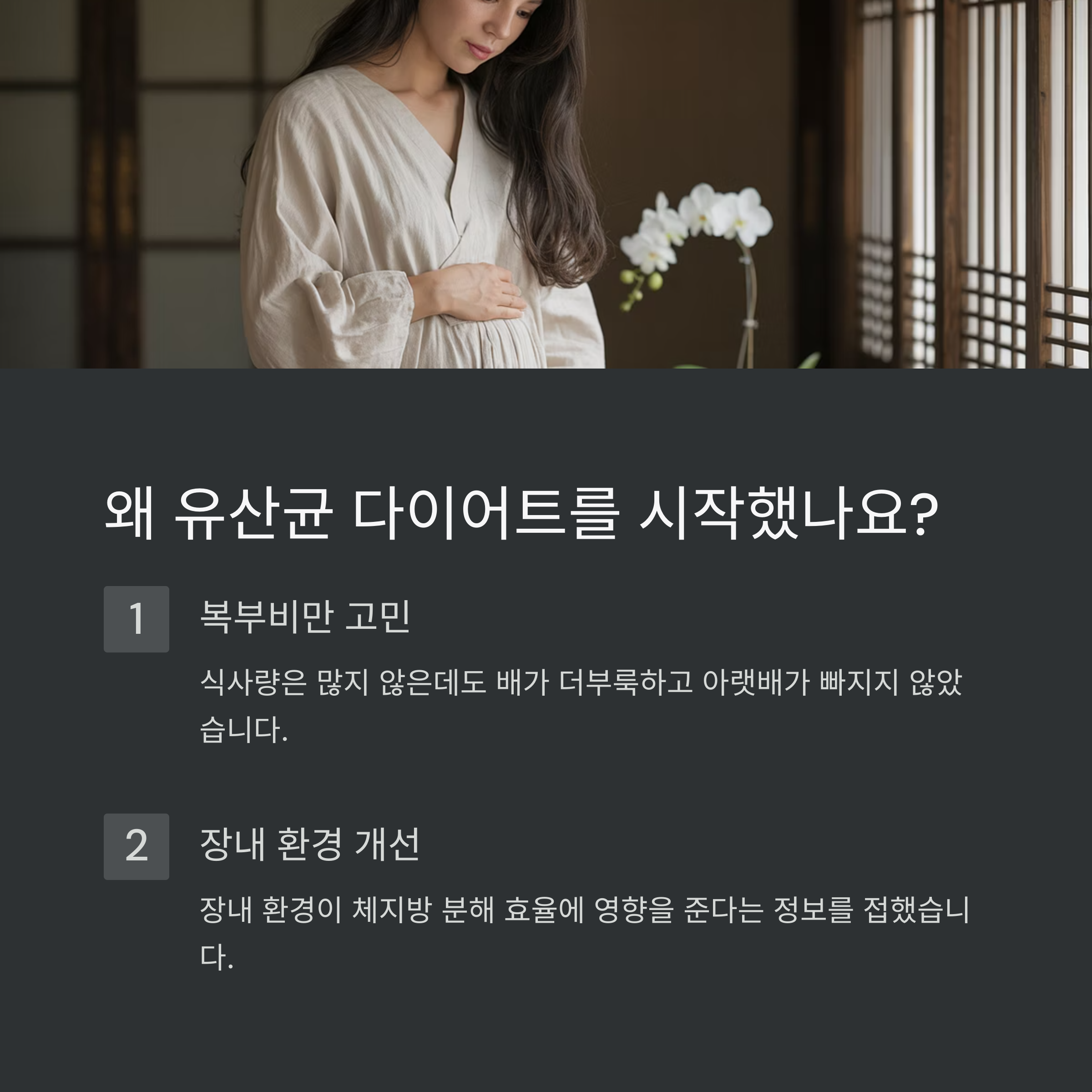 그동안 다이어트를 하면서도 유독 ‘복부비만’이 쉽게 빠지지 않았습니다. 특히 식사량은 많지 않은데도 늘 배가 더부룩하고 가스가 찼고, 아랫배가 빠지지 않는 것이 고민이었습니다. 그러던 중 “장내 환경이 체지방 분해 효율에 영향을 준다”는 정보를 접하게 되었고, 유산균 섭취를 통한 다이어트 효과에 주목하게 되었습니다.