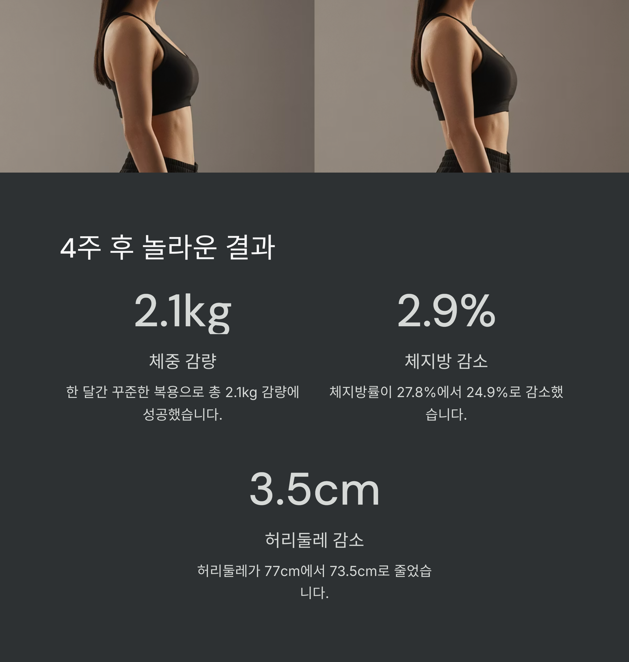 특히 아침 공복감이 줄었고, 군것질 욕구가 현저히 줄어들면서 자연스럽게 하루 섭취 칼로리가 감소했습니다. 복부 중심의 체지방도 완화되며 몸매 라인이 슬림해지는 것이 체감되었습니다.