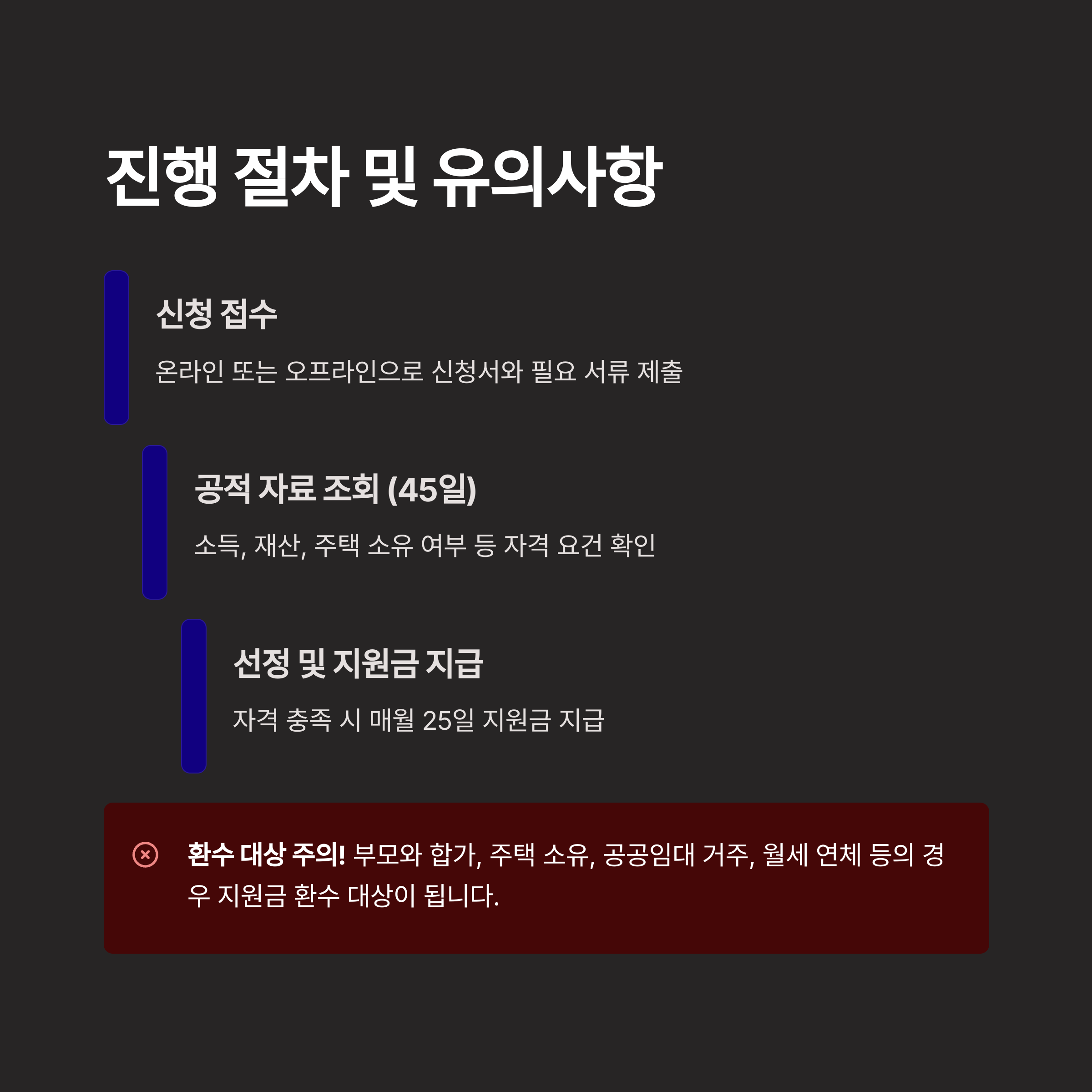 | 주요 유의사항 | 부모 합가·주택 보유 시 환수 대상, 서류 누락 주의 |