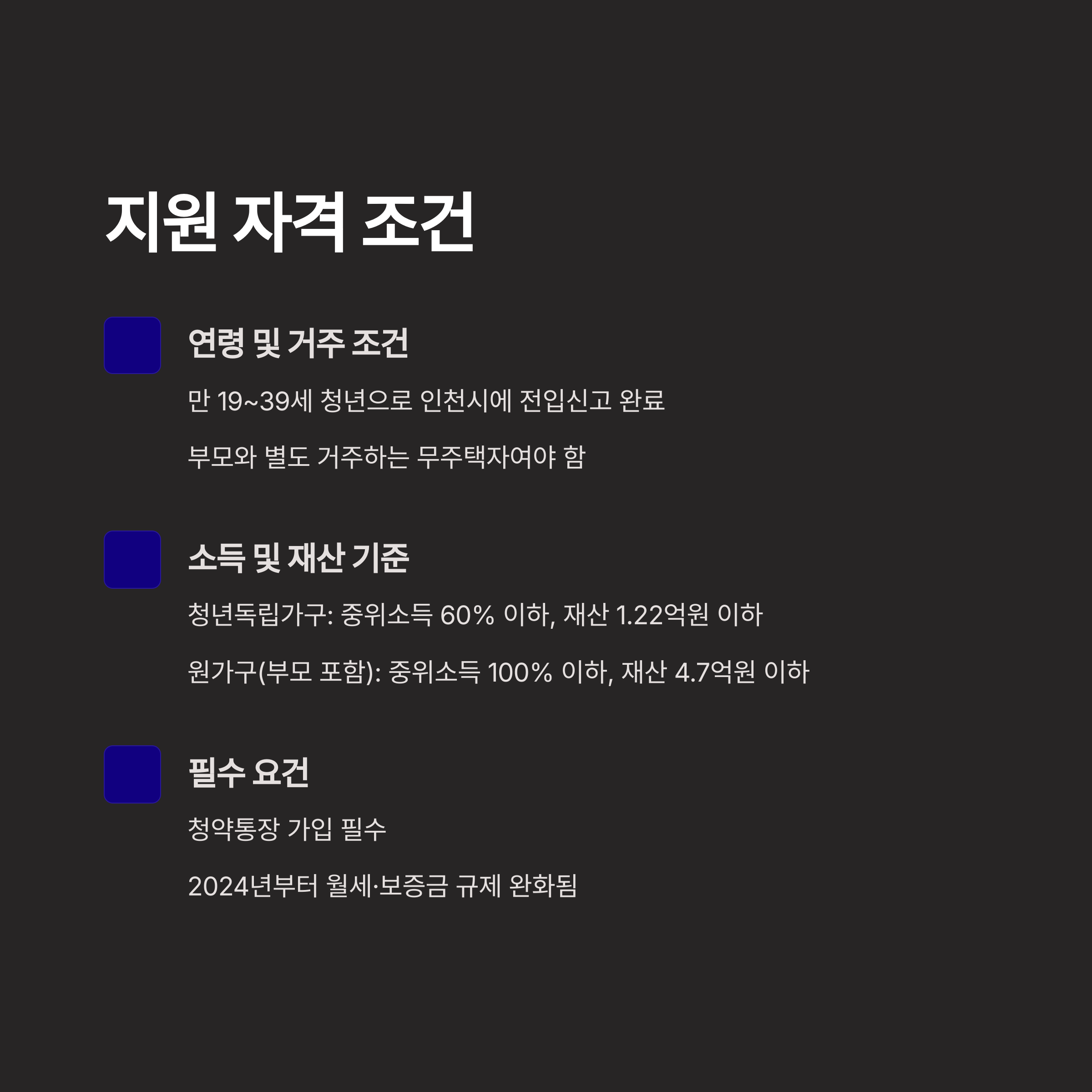 - 원가구(부모 포함): 중위소득 100% 이하, 재산 4.7억 원 이하 (인천청년포털).