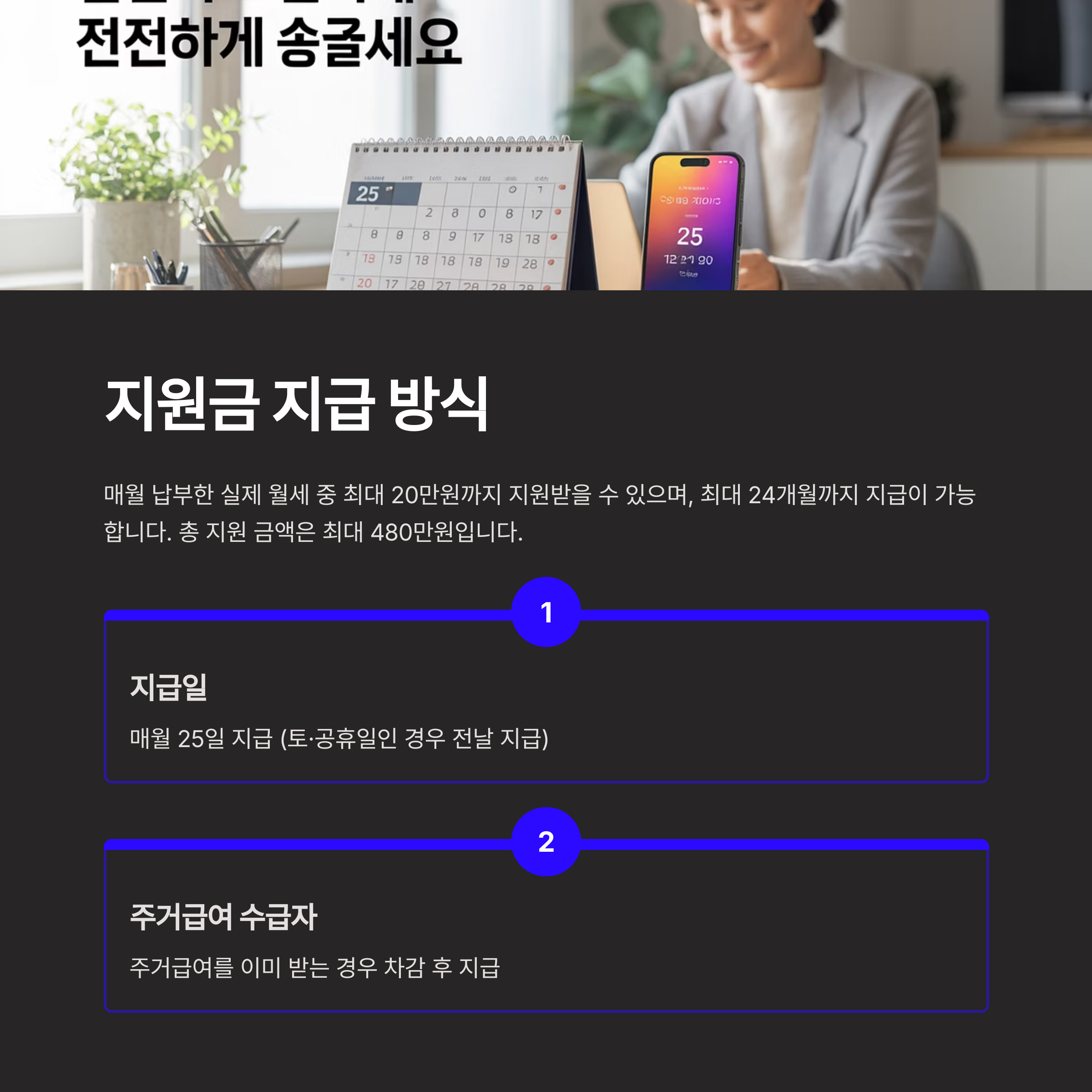 | 지원 한도 | 월 최대 20만 원 × 최대 24개월 (총 480만 원) |