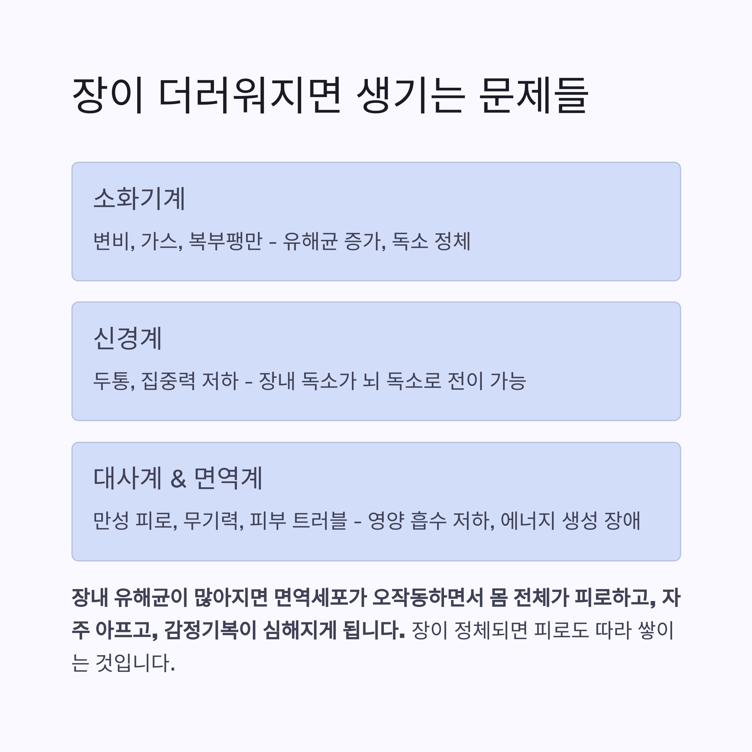 | 두통, 집중력 저하 | 신경계 | 장내 독소 → 뇌 독소로 전이 가능 |
