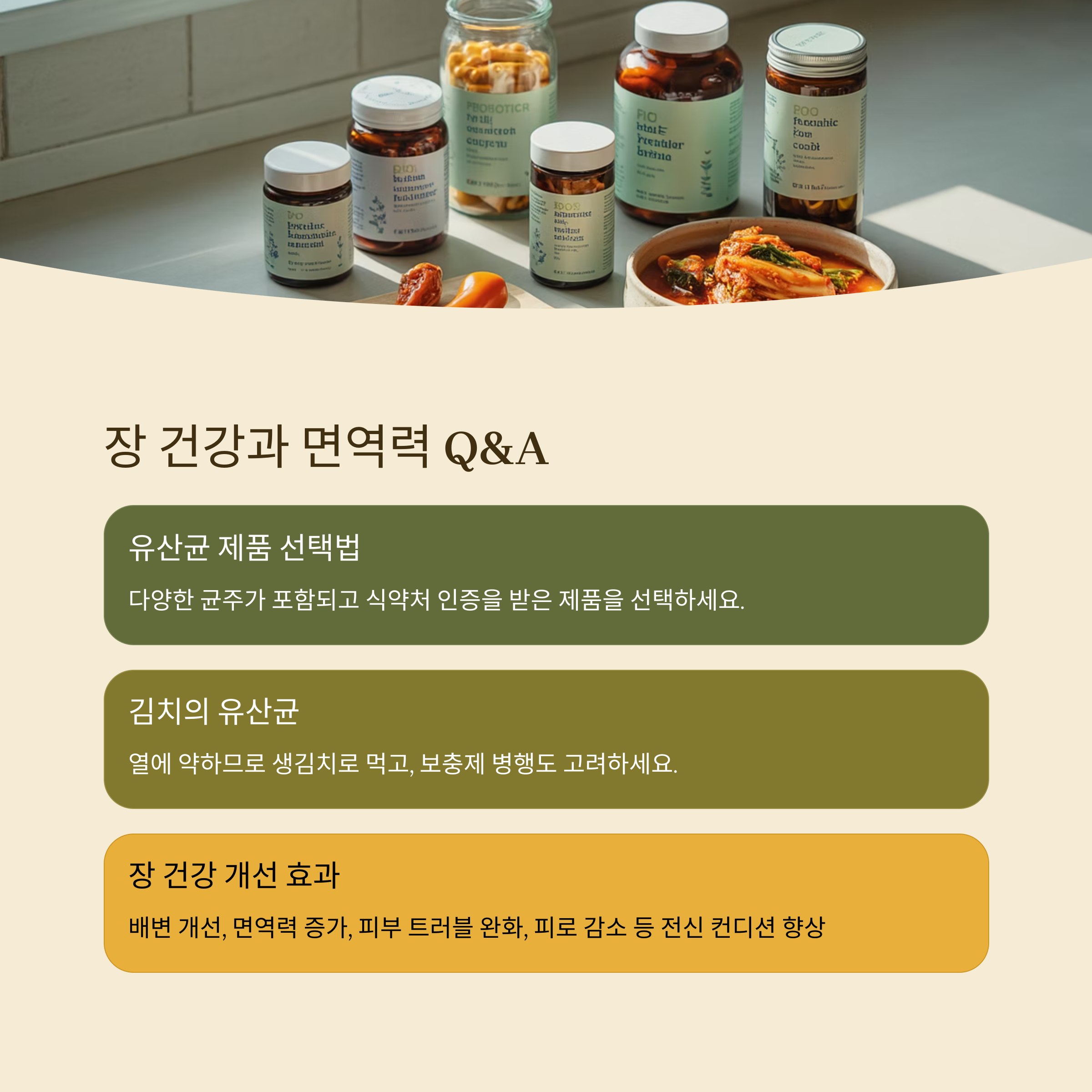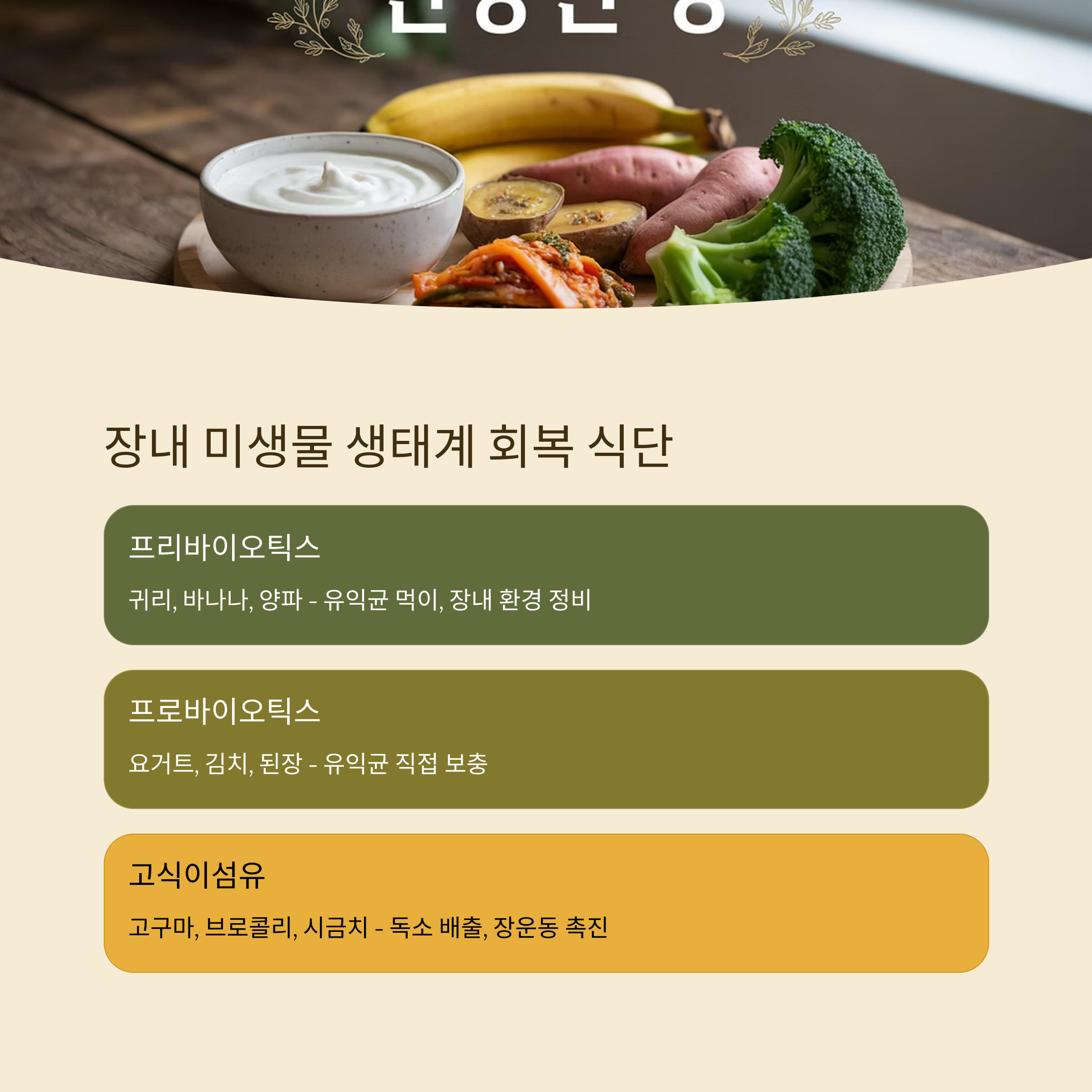 | 프로바이오틱스 | 요거트, 김치, 된장 | 유익균 직접 보충 |