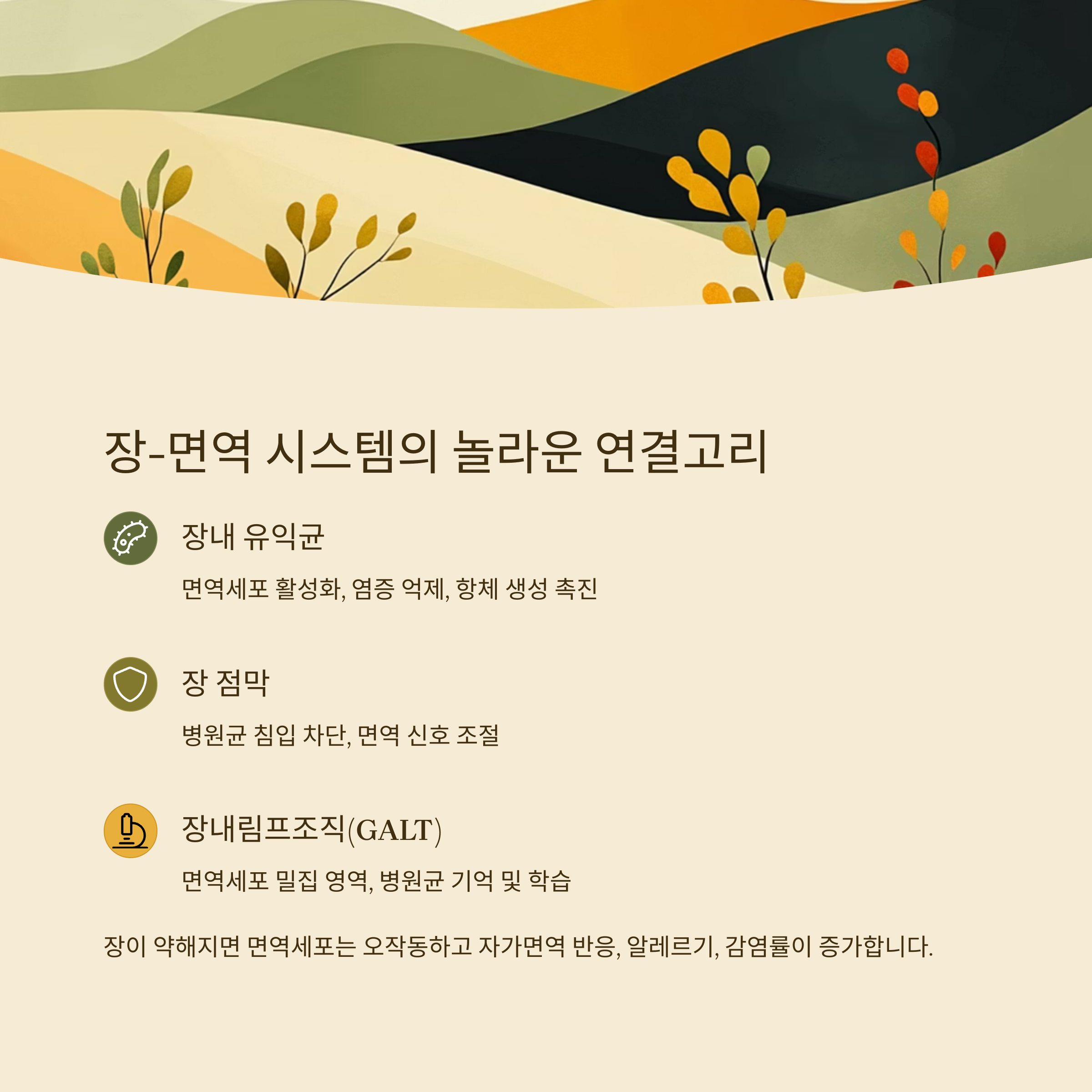 | 장 점막 | 병원균 침입 차단 | 면역 신호 조절 |