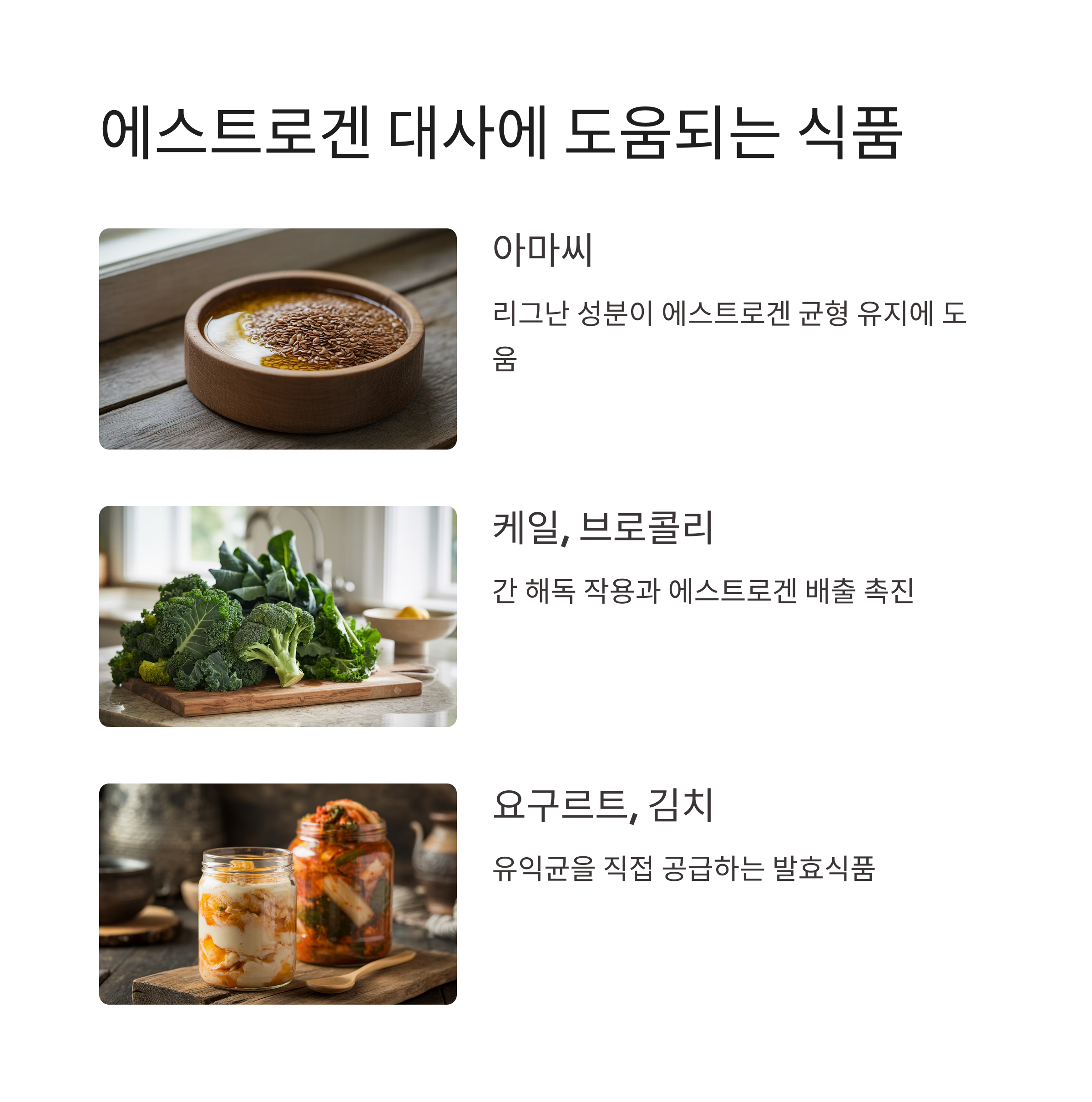 | 케일, 브로콜리 등 | 간 해독 작용과 에스트로겐 배출 촉진 |
