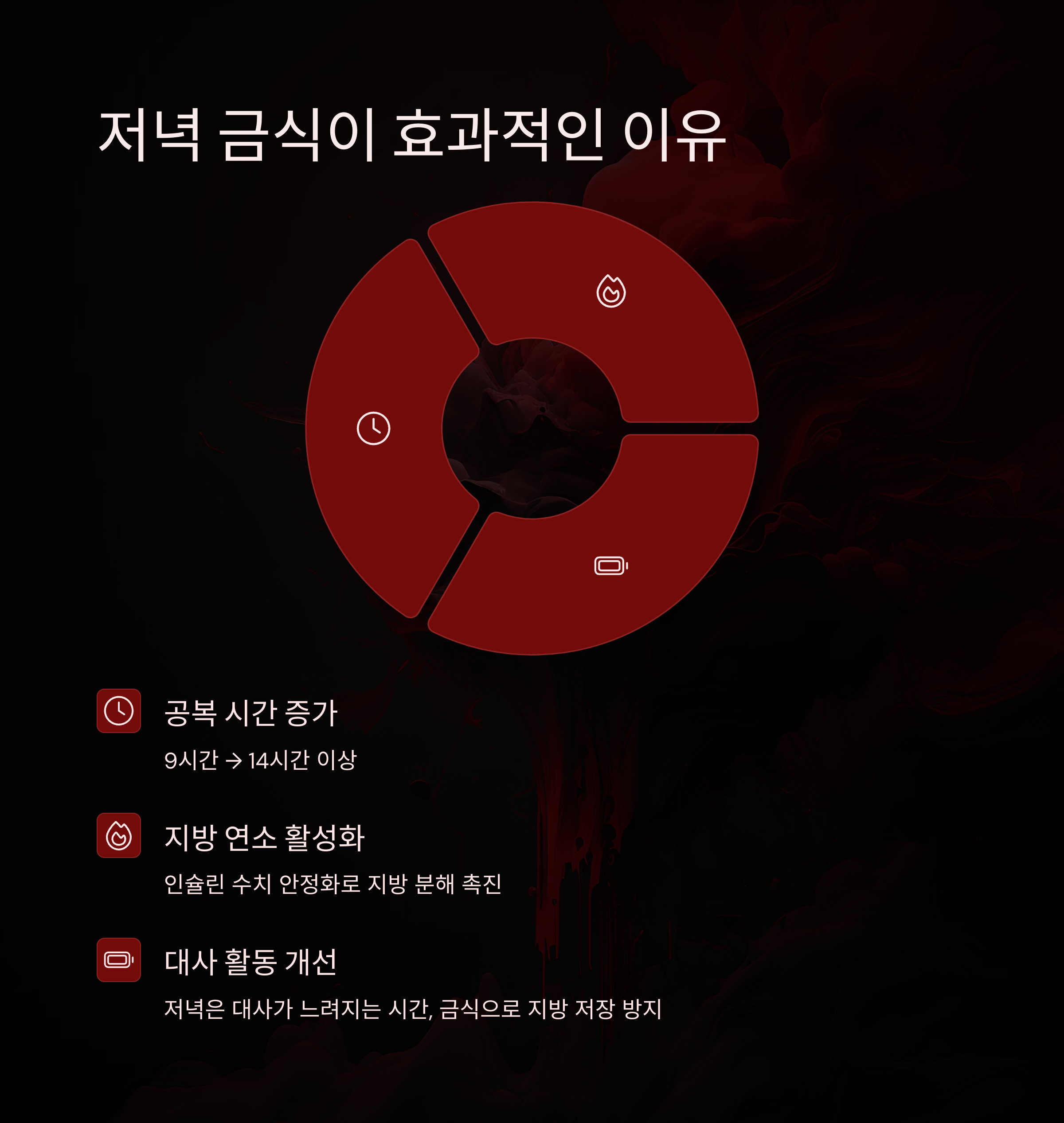 결국 저녁을 금식함으로써 체중 감량뿐 아니라 신진대사 기능도 함께 개선되는 구조입니다.