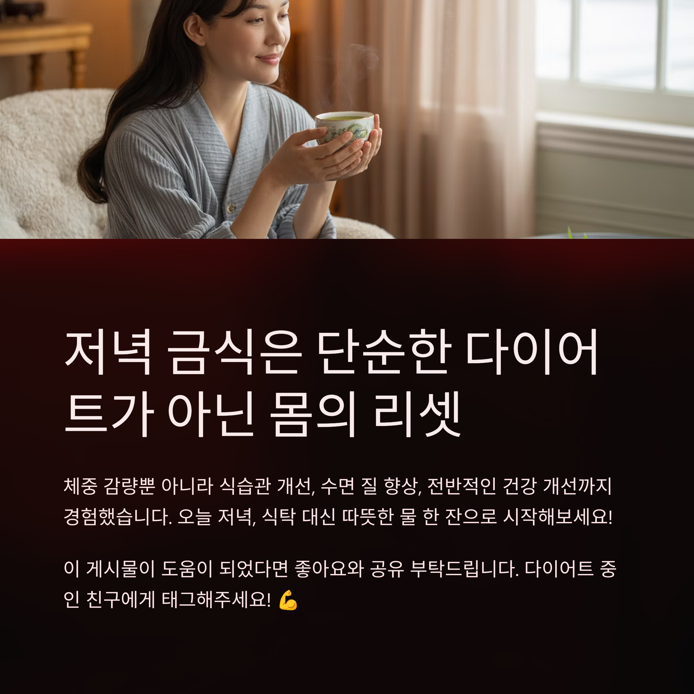 이런 루틴을 만들면 저녁 금식은 절대 고통스러운 다이어트가 아니라, 오히려 생활을 바꾸는 강력한 습관이 됩니다.