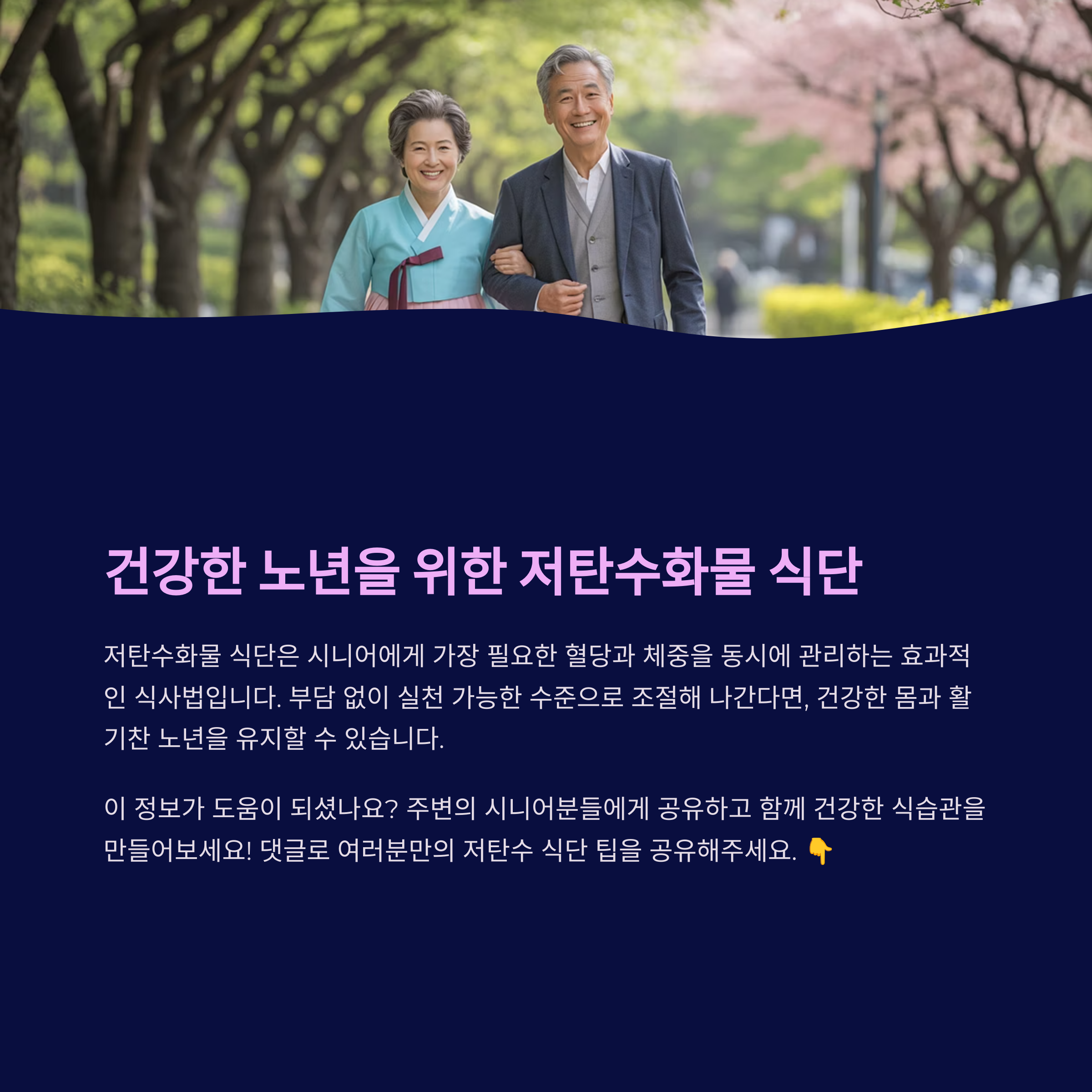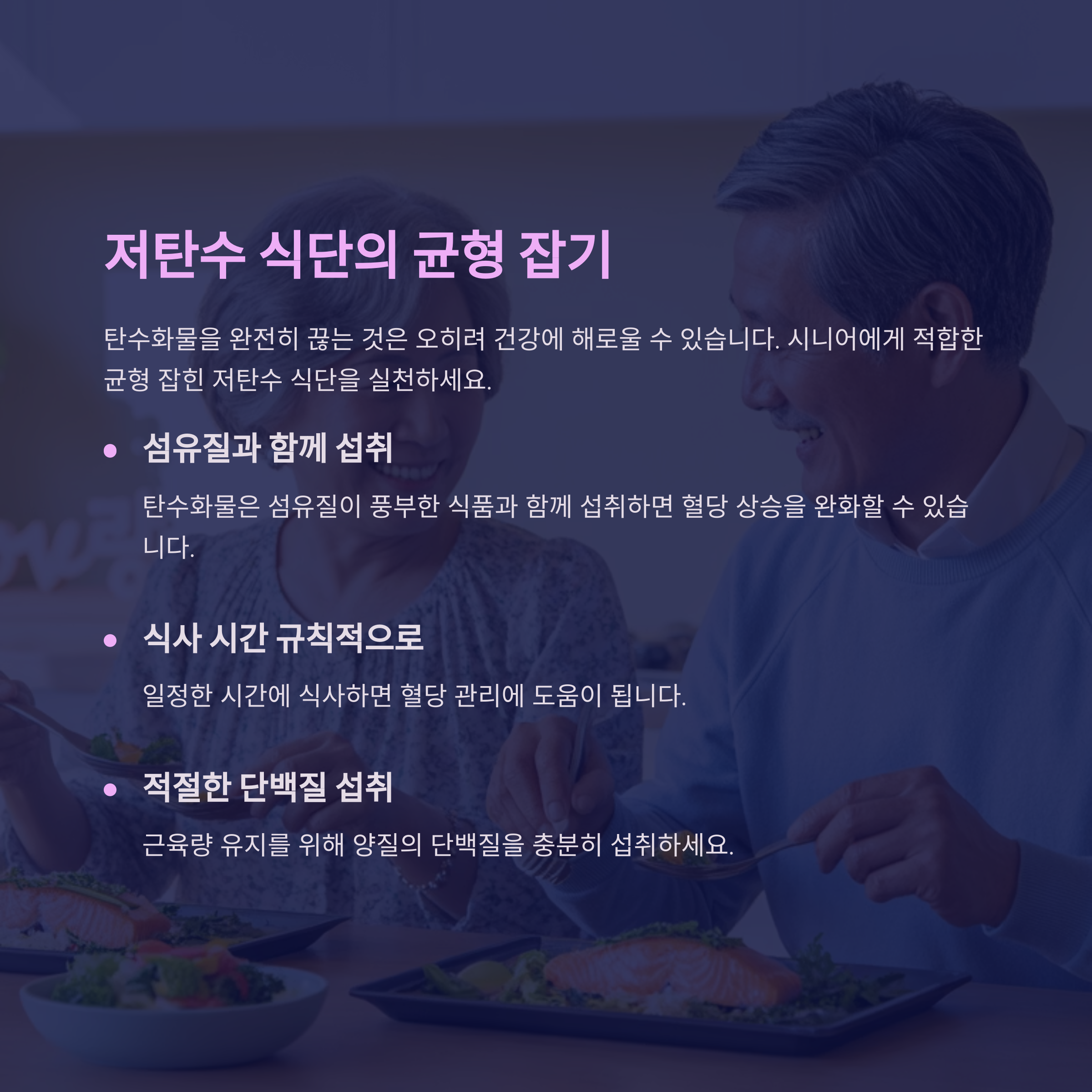 저탄수화물 식단은 시니어에게 가장 필요한 혈당과 체중을 동시에 관리하는 식사법입니다. 부담 없이 실천 가능한 수준으로 조절해 나간다면, 건강한 몸과 활기찬 노년을 유지할 수 있습니다.