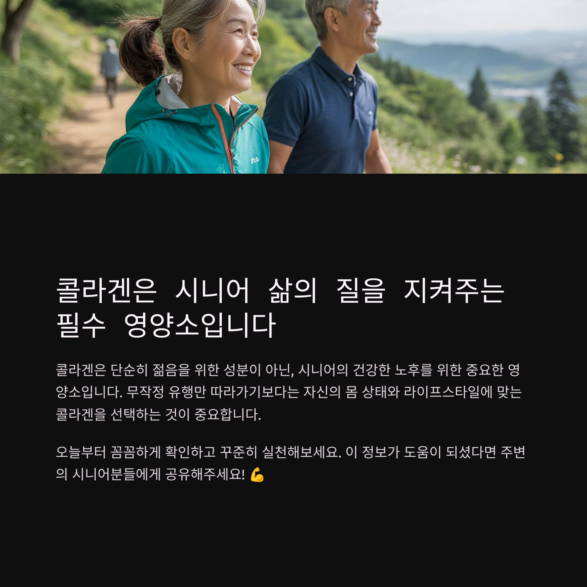 콜라겐은 단지 젊음을 위한 성분이 아닌, 시니어 삶의 질을 지켜주는 필수 영양소입니다. 무작정 유행만 따라가기보다는, 내 몸 상태와 라이프스타일에 맞는 콜라겐 선택이 가장 중요합니다. 오늘부터 꼼꼼하게 확인하고, 꾸준히 실천해보세요.