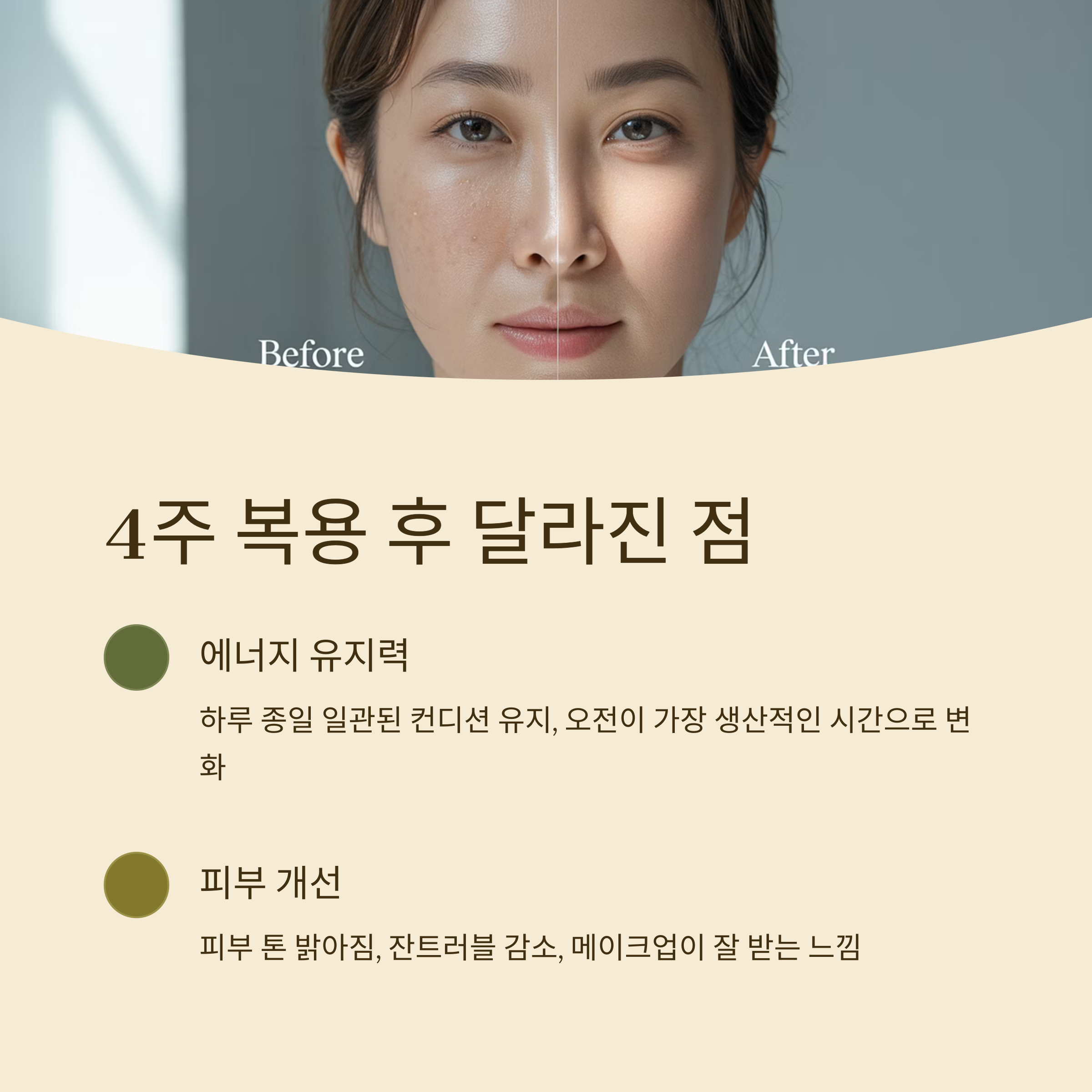 | 피부 컨디션 | 칙칙하고 생기 없음 | 윤기 있고 톤 개선됨 |
