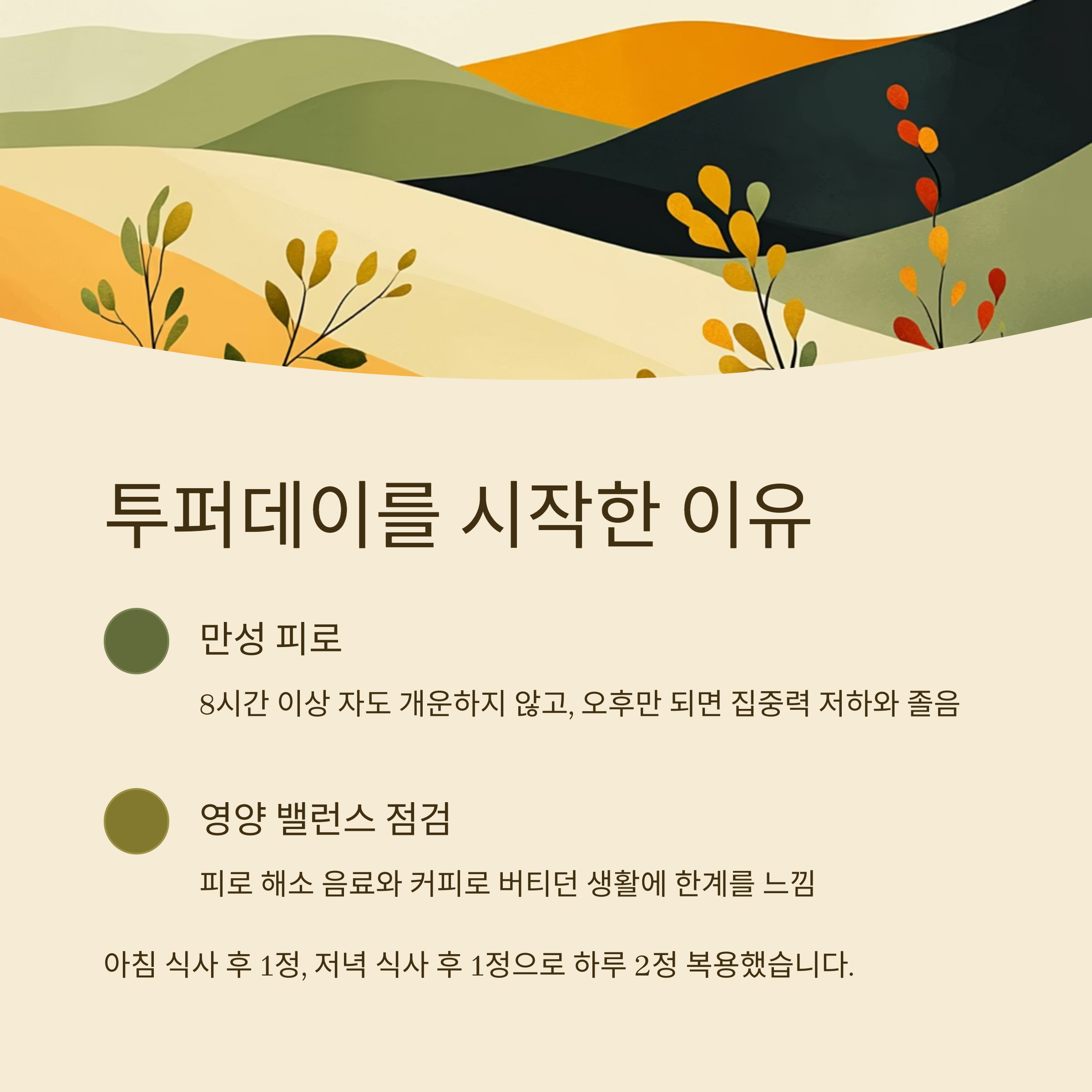 투퍼데이를 복용하게 된 직접적인 계기는 ‘만성 피로’였습니다. 매일 8시간 이상 자도 개운하지 않고, 오후만 되면 집중력이 떨어지고 졸음이 오는 상태가 계속됐죠. 피로 해소 음료나 커피로 버티던 생활에 한계를 느끼고, 영양 자체를 점검해야겠다는 생각에 멀티비타민을 찾던 중 투퍼데이를 알게 되었습니다.