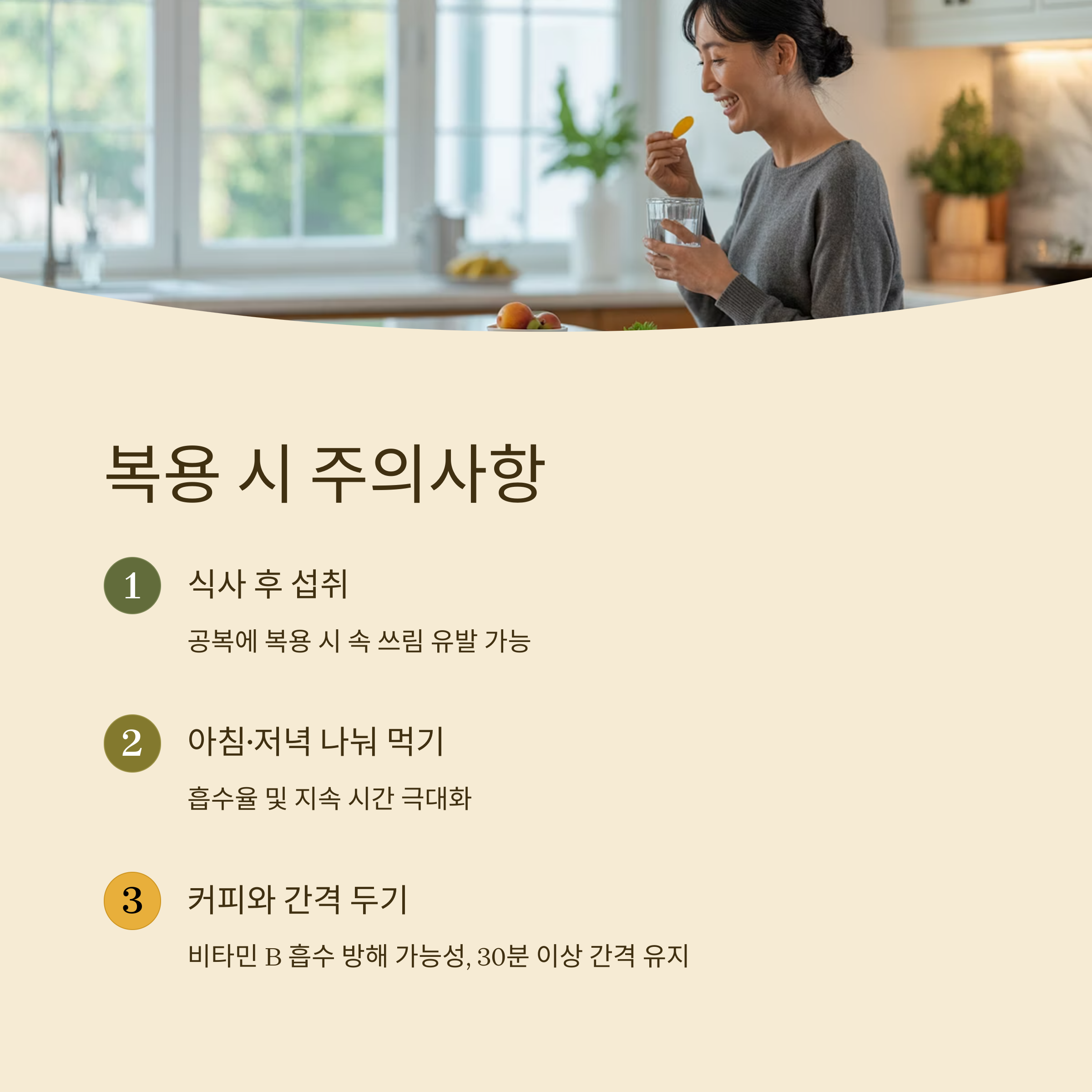 | 커피 섭취 30분 이상 간격 | 비타민 B 흡수를 방해할 수 있어 시간 간격 유지 필수 |