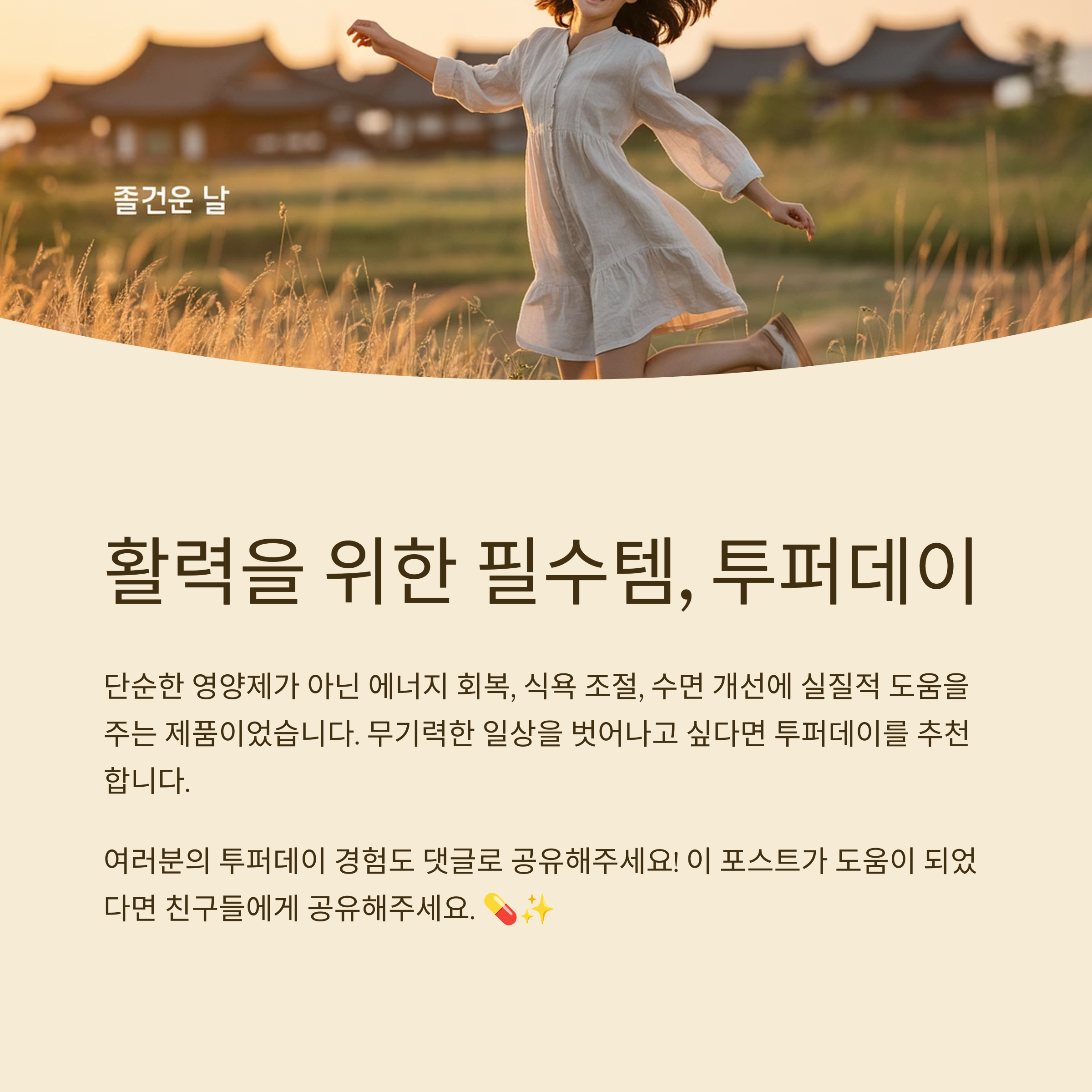 특별한 식단이나 운동 없이도 ‘에너지 수준’이 바뀌고, 하루의 질이 개선되는 걸 경험하고 싶다면 투퍼데이는 분명 훌륭한 선택이 될 수 있습니다. 무기력한 일상을 벗어나고 싶은 분들에게 진심으로 추천할 만한 멀티비타민입니다.