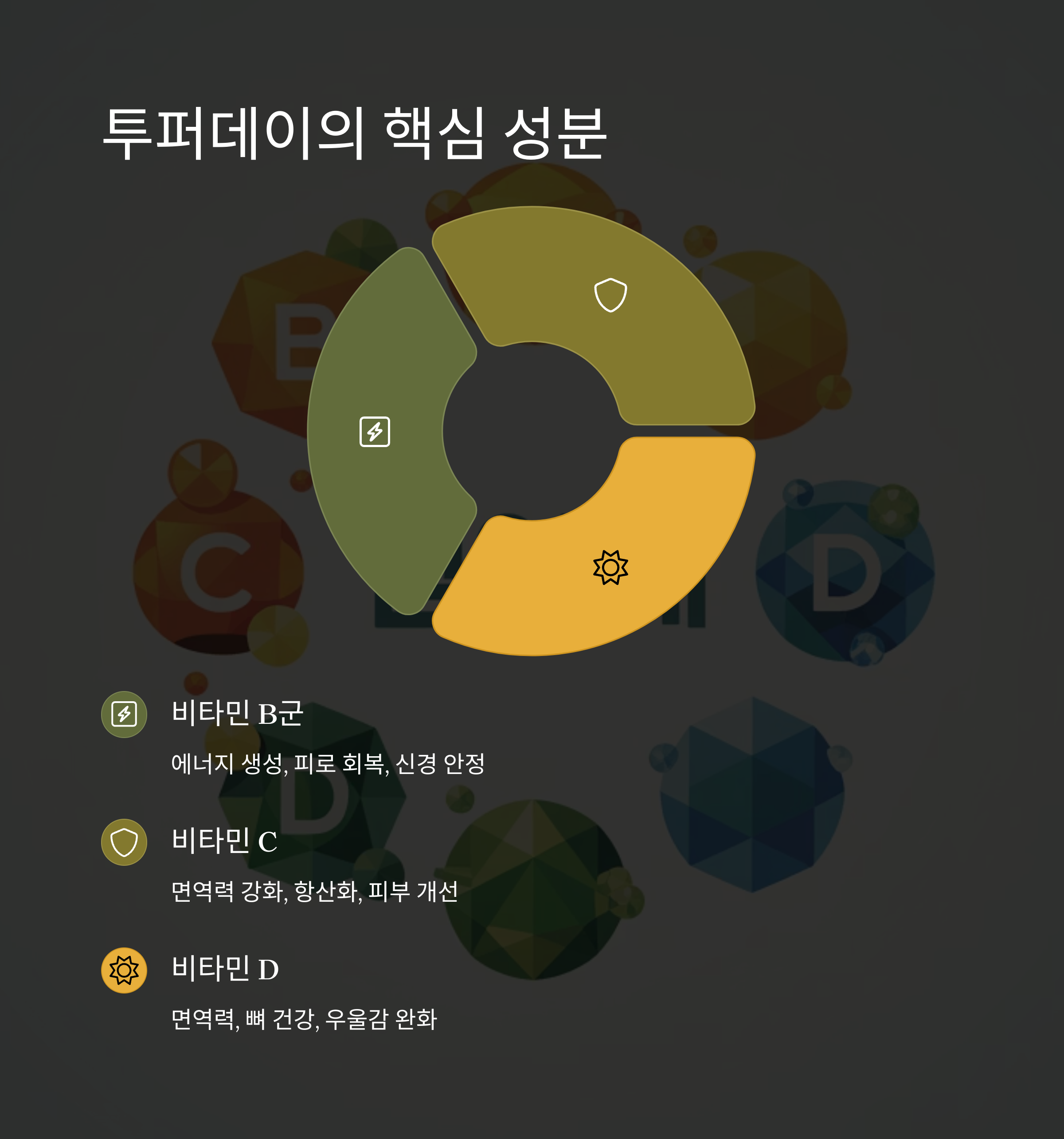 투퍼데이가 많은 사람들에게 사랑받는 이유 중 하나는 고함량의 비타민·미네랄 성분입니다. 일반 제품 대비 비타민 B군과 항산화 성분이 풍부하며, 다음과 같은 구성으로 건강 전반에 도움을 줍니다.