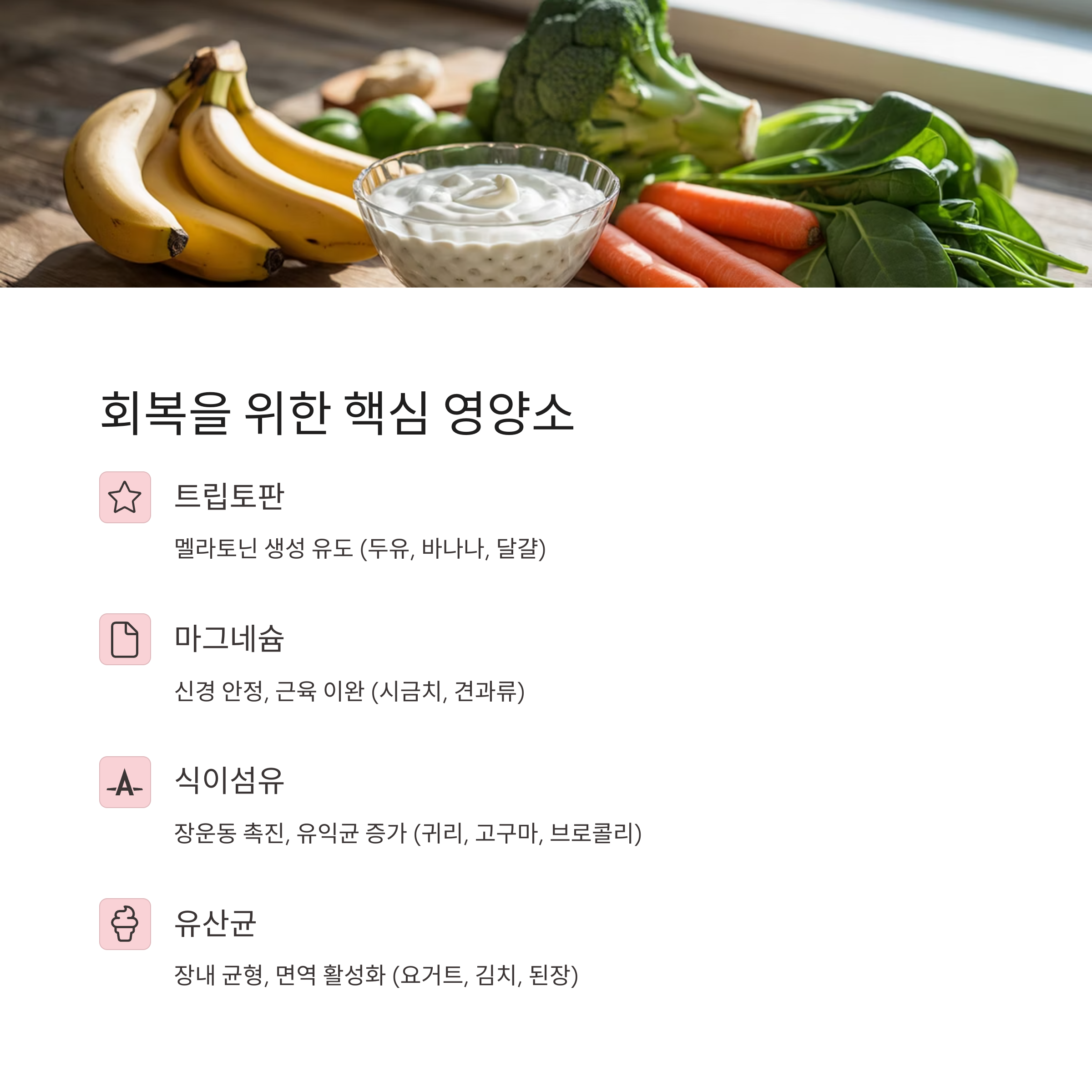| 트립토판 | 멜라토닌 생성 유도 | 두유, 바나나, 달걀 |