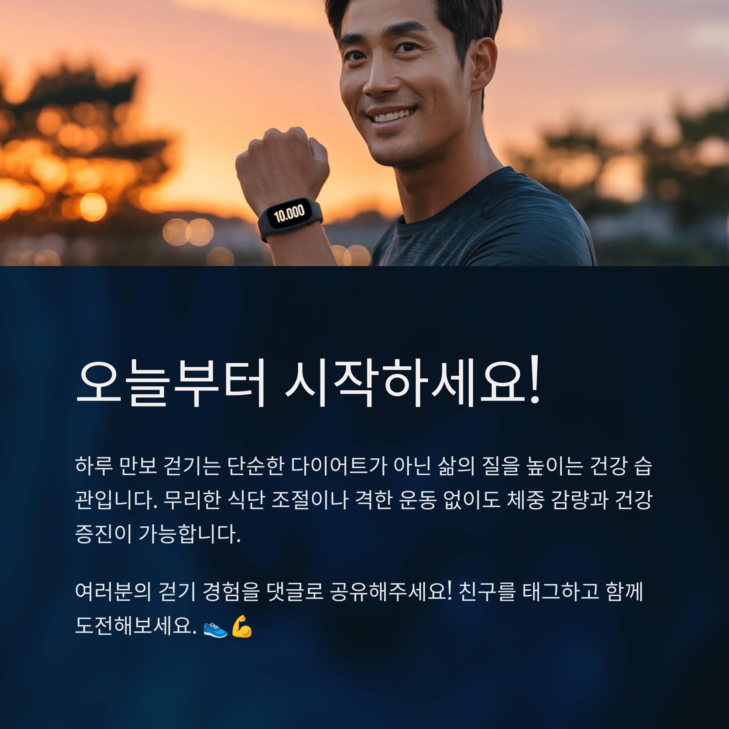 하루 만보 걷기의 가장 큰 장점은 ‘쉬움’과 ‘지속 가능성’입니다. 무리한 식단 조절이나 격한 운동 없이도 체중 감량과 건강 증진이 가능했고, 무엇보다 지치지 않았습니다. 특히 정신적으로 안정되고, 자신과의 약속을 지킨다는 뿌듯함은 걷기 이상의 가치였습니다.