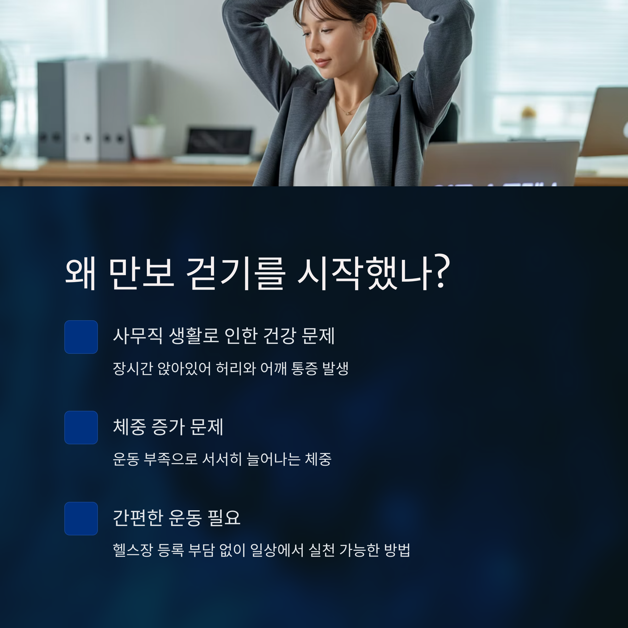 하루 만보 걷기를 시작하게 된 건 사무직으로 장시간 앉아 있는 생활 때문이었습니다. 허리와 어깨에 통증이 자주 생기고, 체중도 조금씩 늘어나면서 운동의 필요성을 절실히 느끼게 되었죠. 하지만 헬스장 등록은 귀찮고 부담스러워, 일상 속에서 간단하게 실천할 수 있는 만보 걷기를 선택하게 되었습니다.