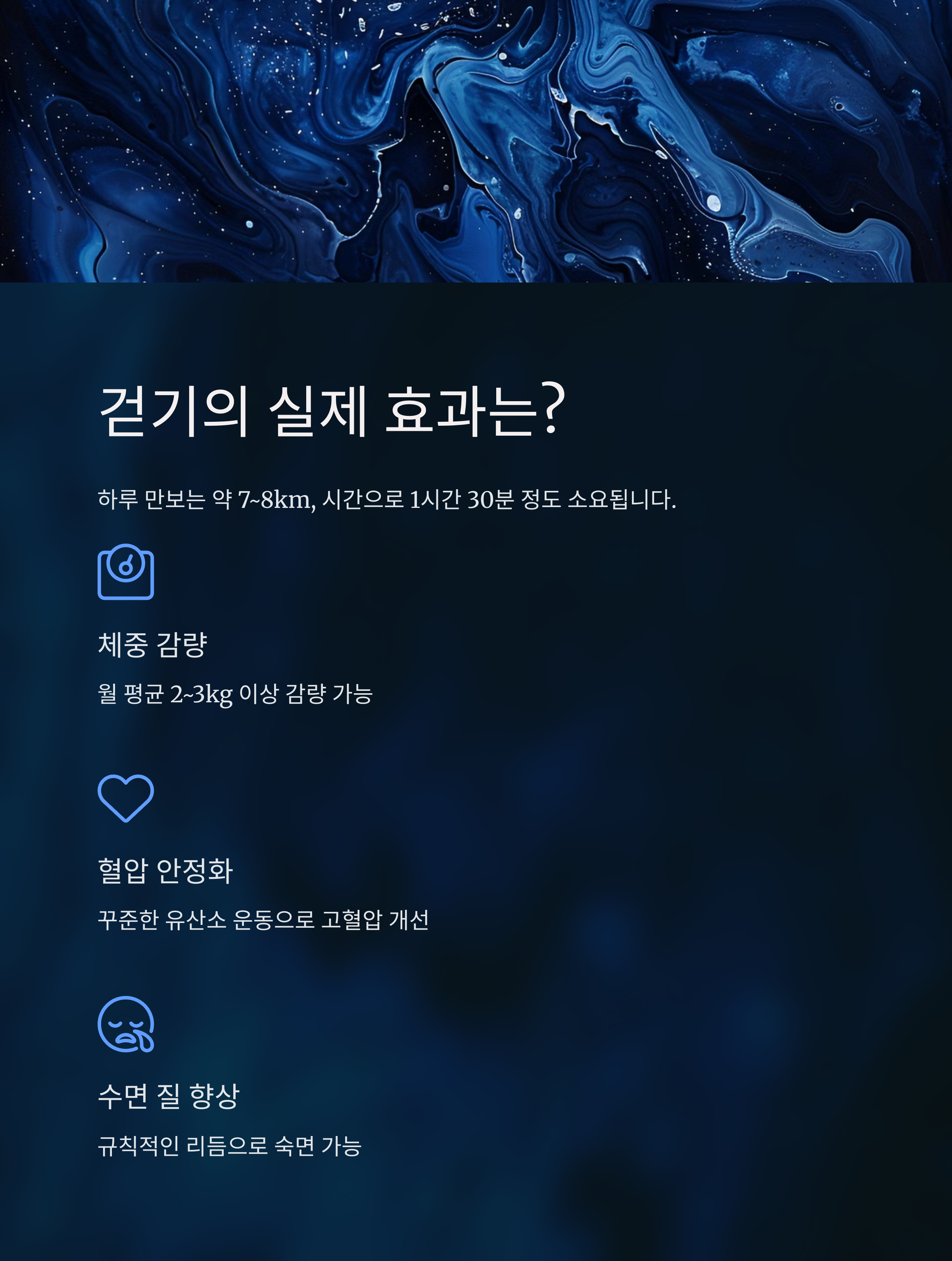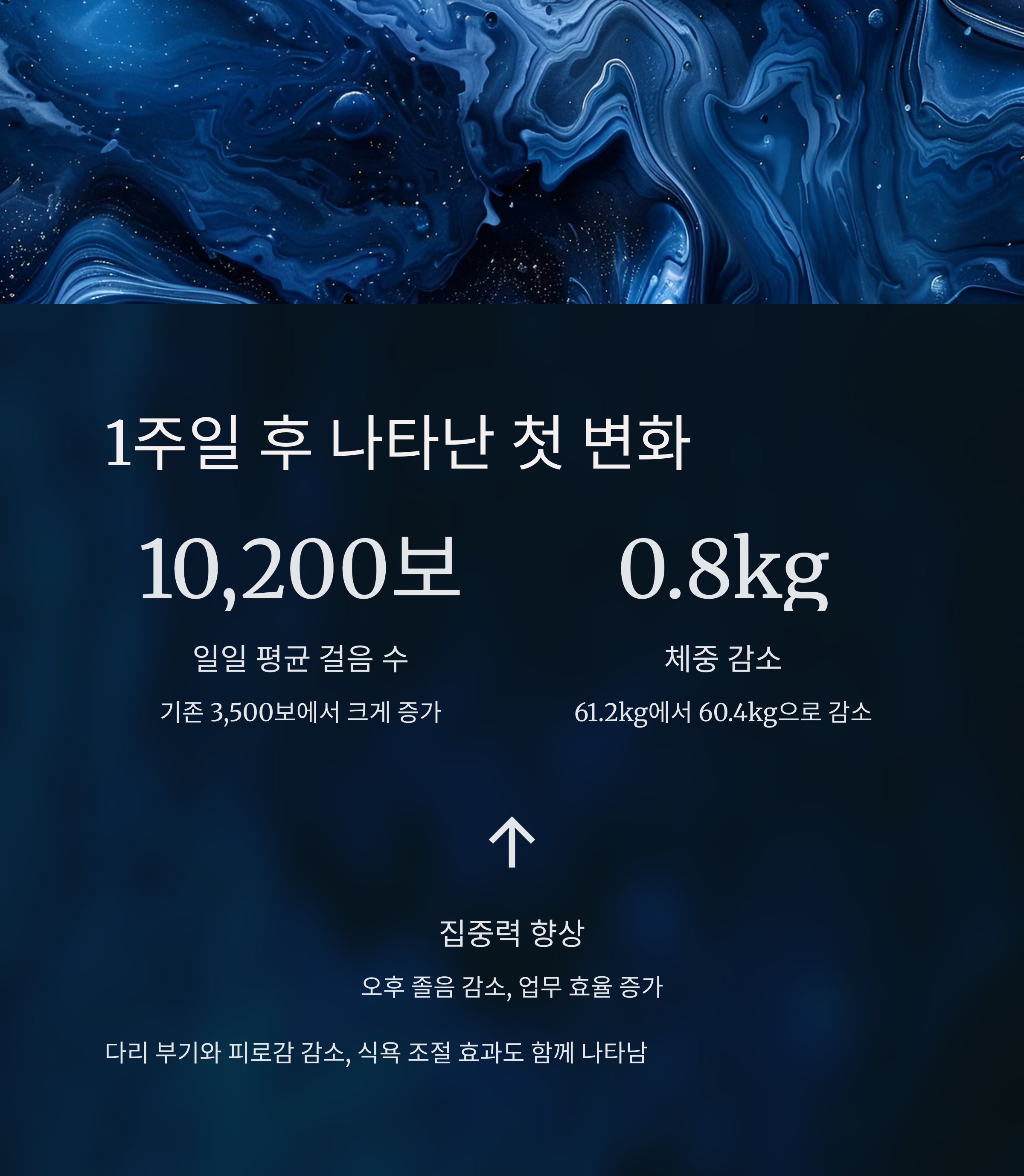 피부톤이 밝아지고 숙면을 취하는 날이 늘어난 것도 예상 밖의 수확이었습니다. 매일 걷기를 하며 스트레스가 줄고, 생각이 정리되는 효과도 함께 따라왔습니다.