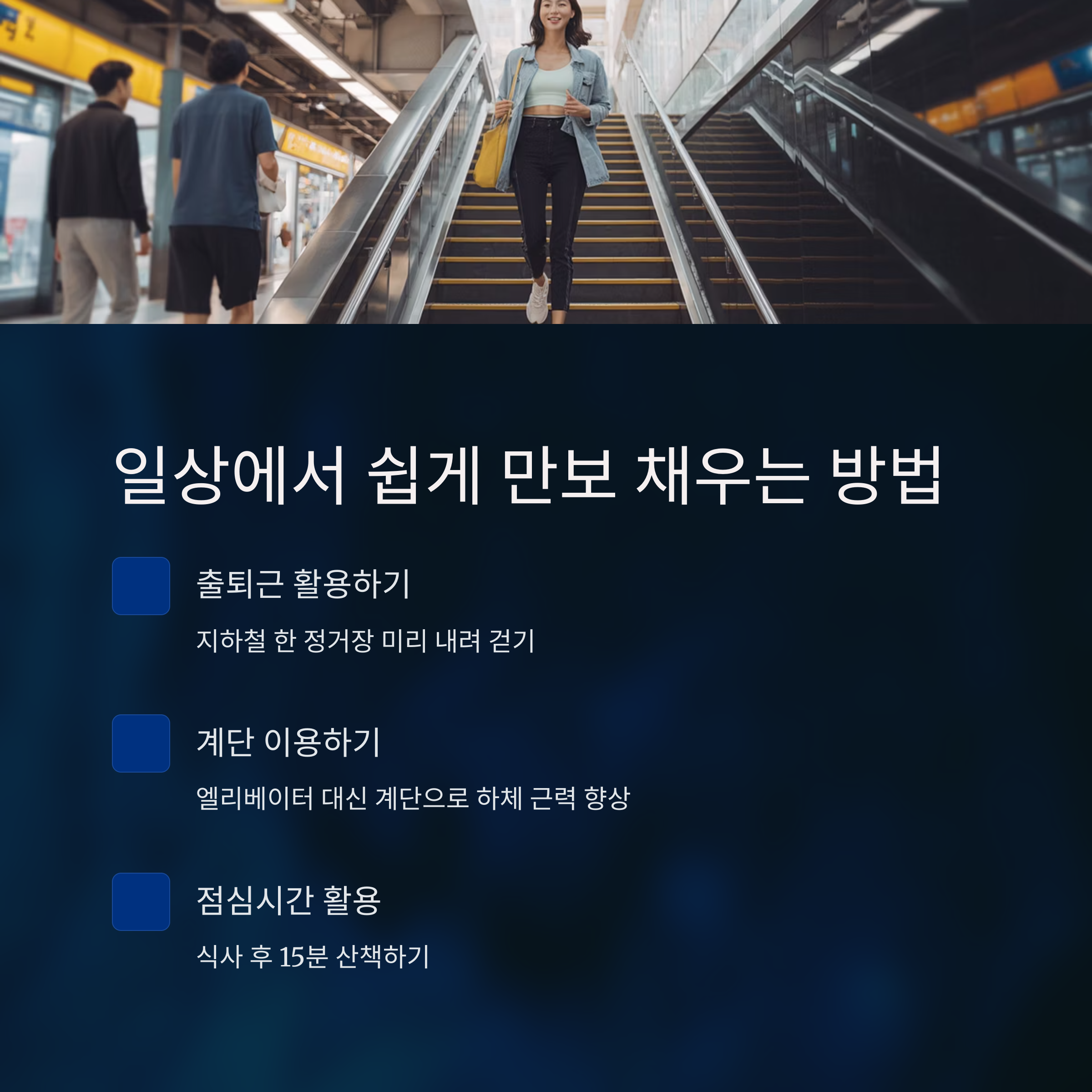 만보 걷기라고 해서 처음부터 완벽하게 만보를 채우려 할 필요는 없습니다. 저는 첫 주는 7,000보, 둘째 주부터 10,000보 이상으로 늘렸고, 점차 자연스럽게 늘어났습니다. 특히 아래처럼 생활 속 습관만 바꿔도 걸음 수가 확연히 증가합니다.