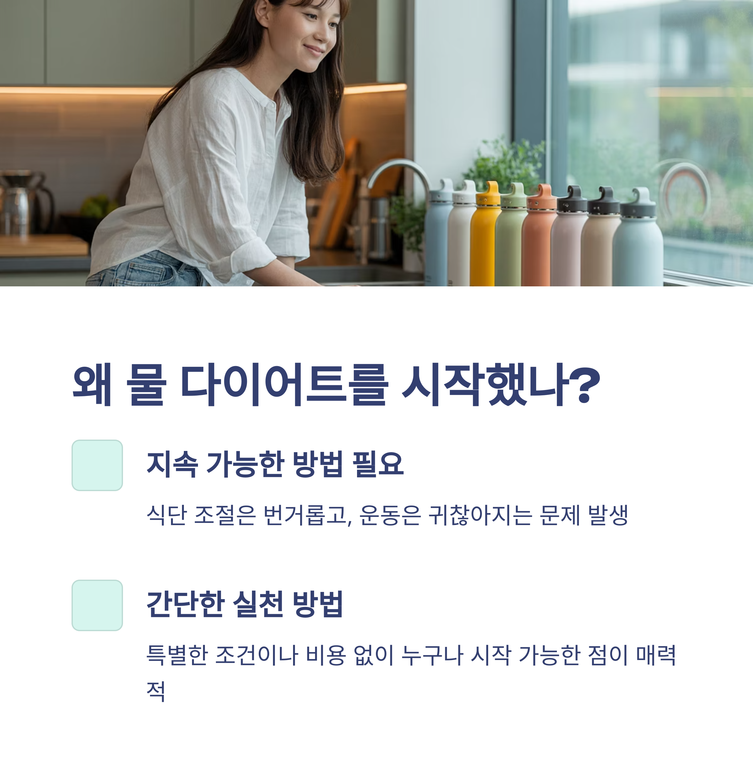 다이어트를 반복하면서 가장 어렵게 느꼈던 건 ‘지속성’이었습니다. 식단 조절은 번거롭고, 운동은 귀찮아지기 일쑤였죠. 그러던 중 "하루 2리터 물 마시기만 해도 살이 빠진다"는 내용을 보고 관심이 생겼습니다.