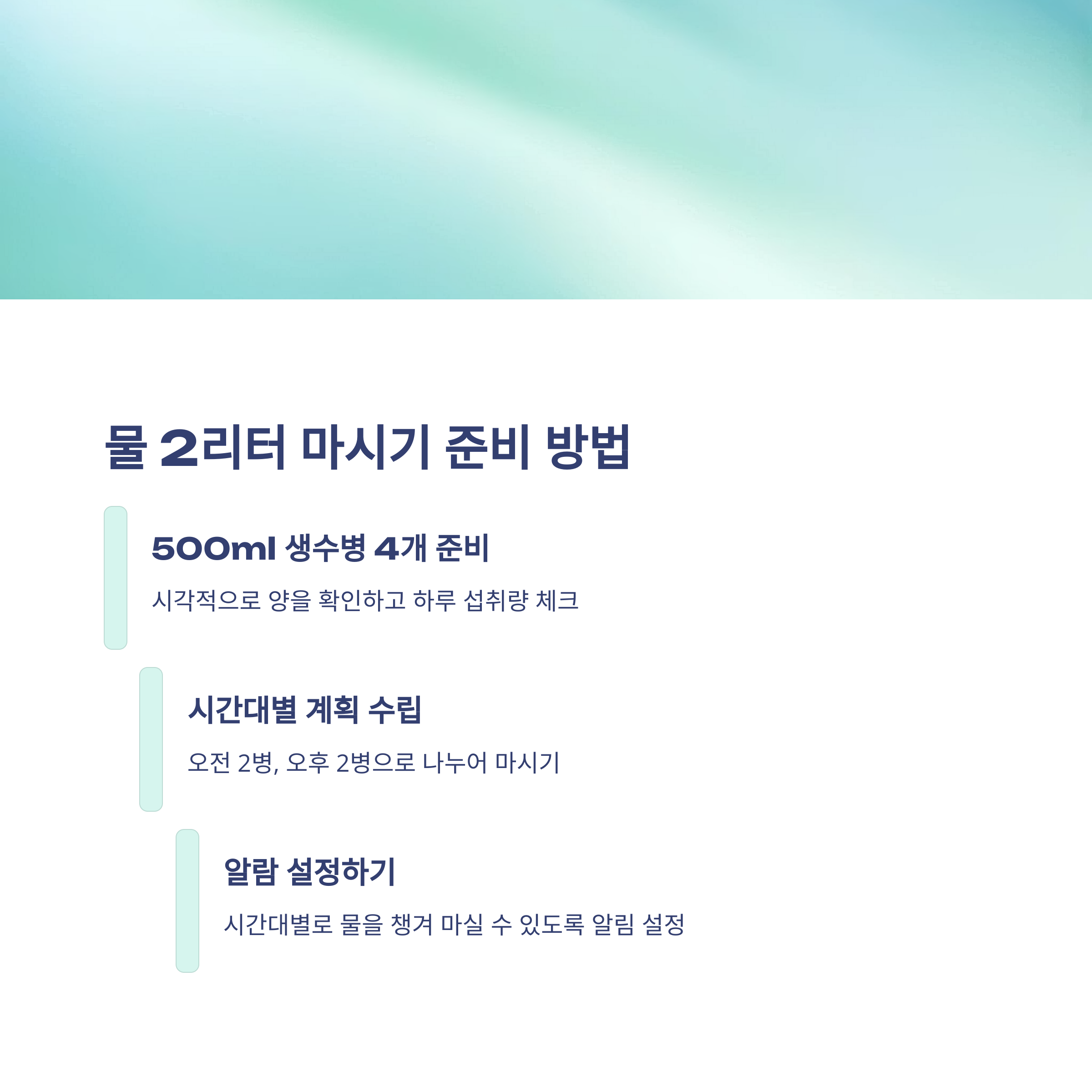 하루 2리터를 어떻게 나눠 마시느냐도 매우 중요합니다. 몰아서 마시기보다는 시간대별로 나누어 마셔야 체내 수분 밸런스를 안정적으로 유지할 수 있습니다.