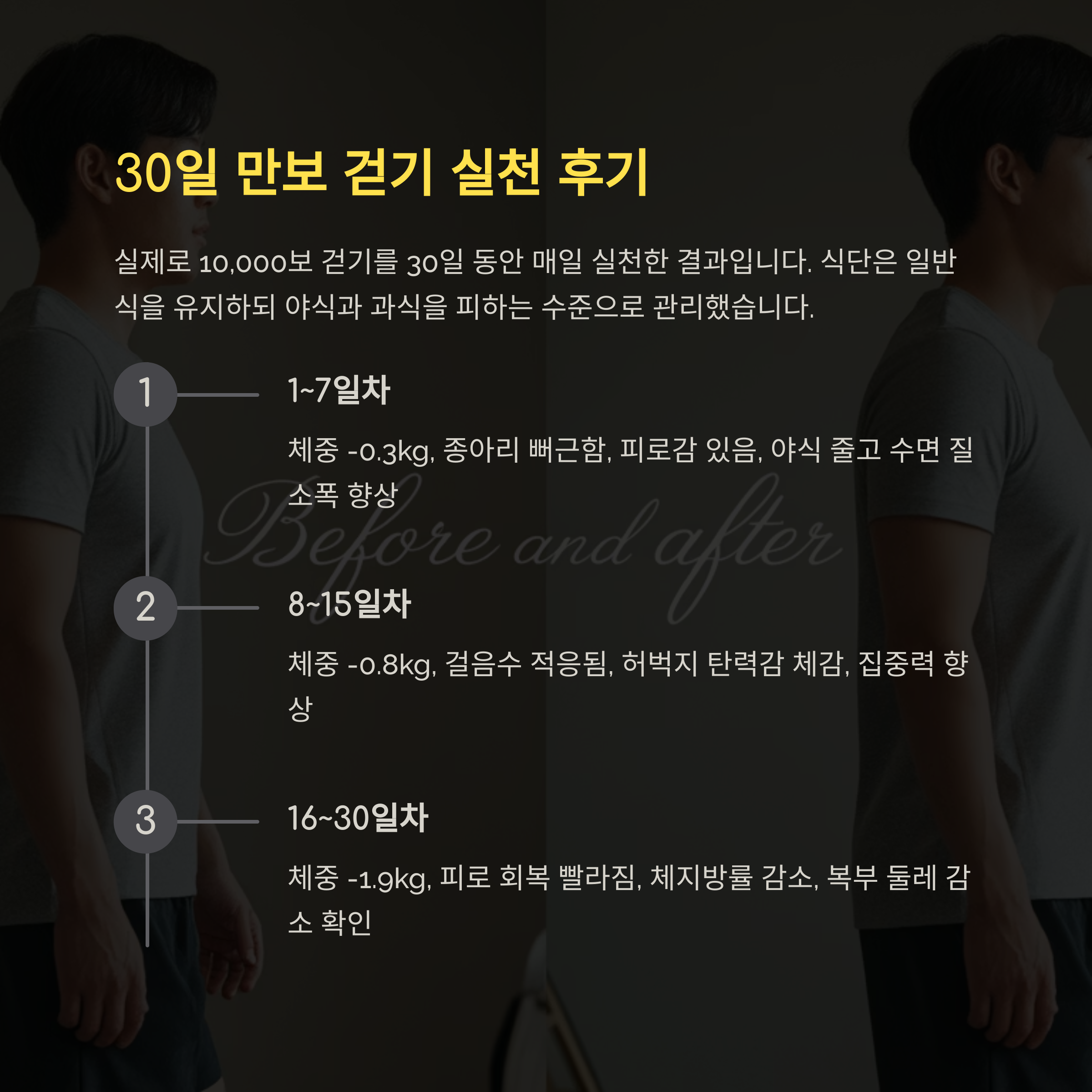 | 8~15일차 | -0.8kg | 걸음수 적응됨 | 허벅지 탄력감 체감, 집중력 향상 |