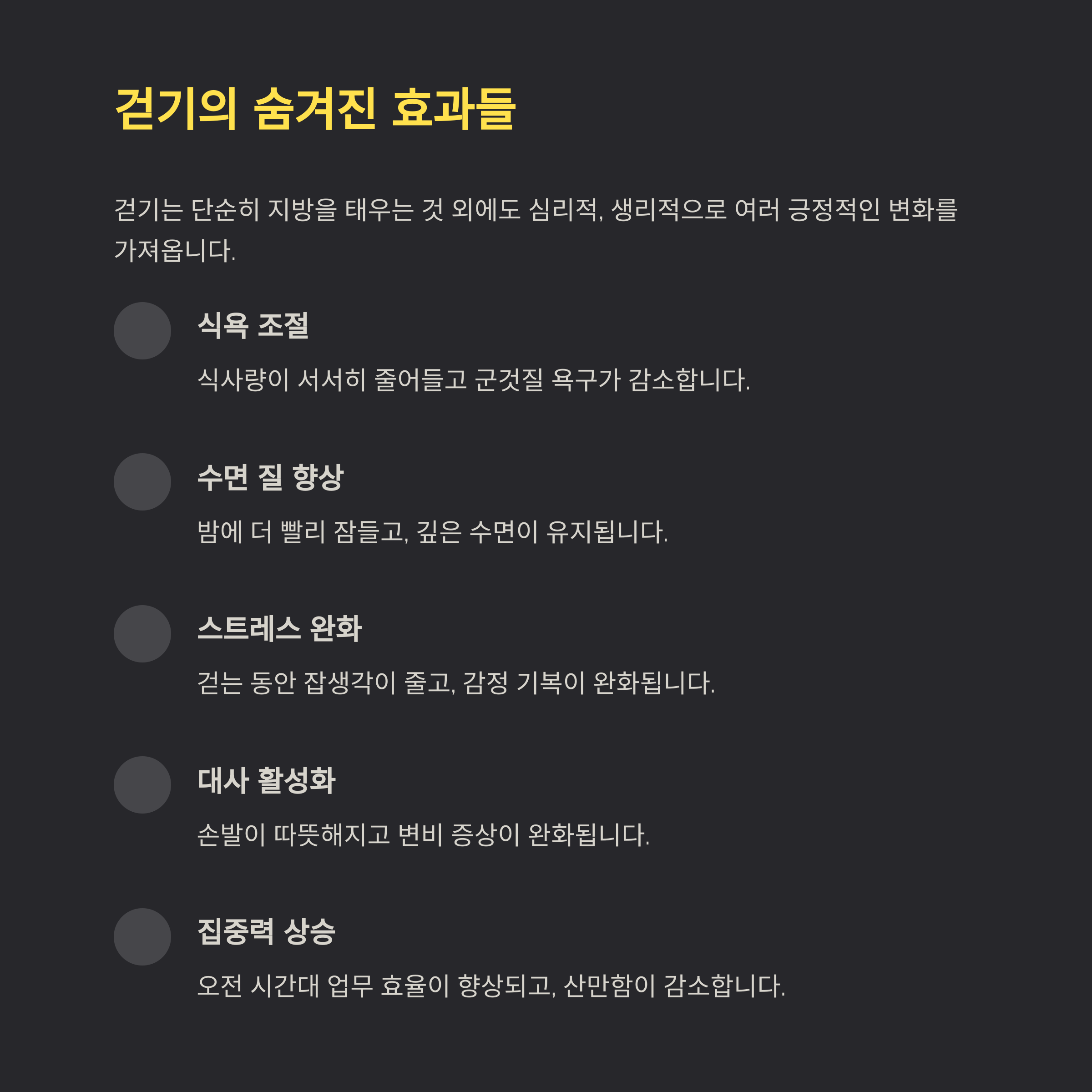 | 스트레스 완화 | 걷는 동안 잡생각 줄고, 감정 기복 완화 |