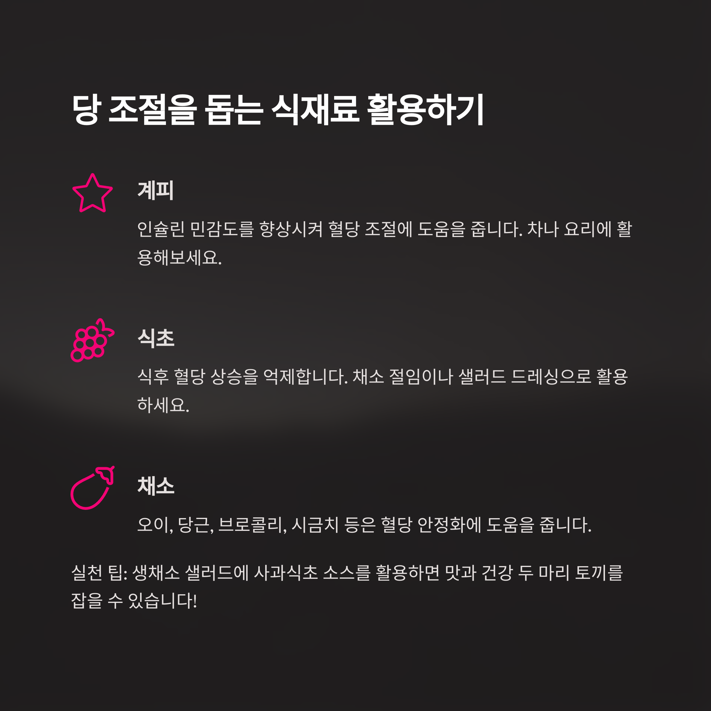 - 식초: 식후 혈당 상승 억제, 단 채소 절임 위주로 활용