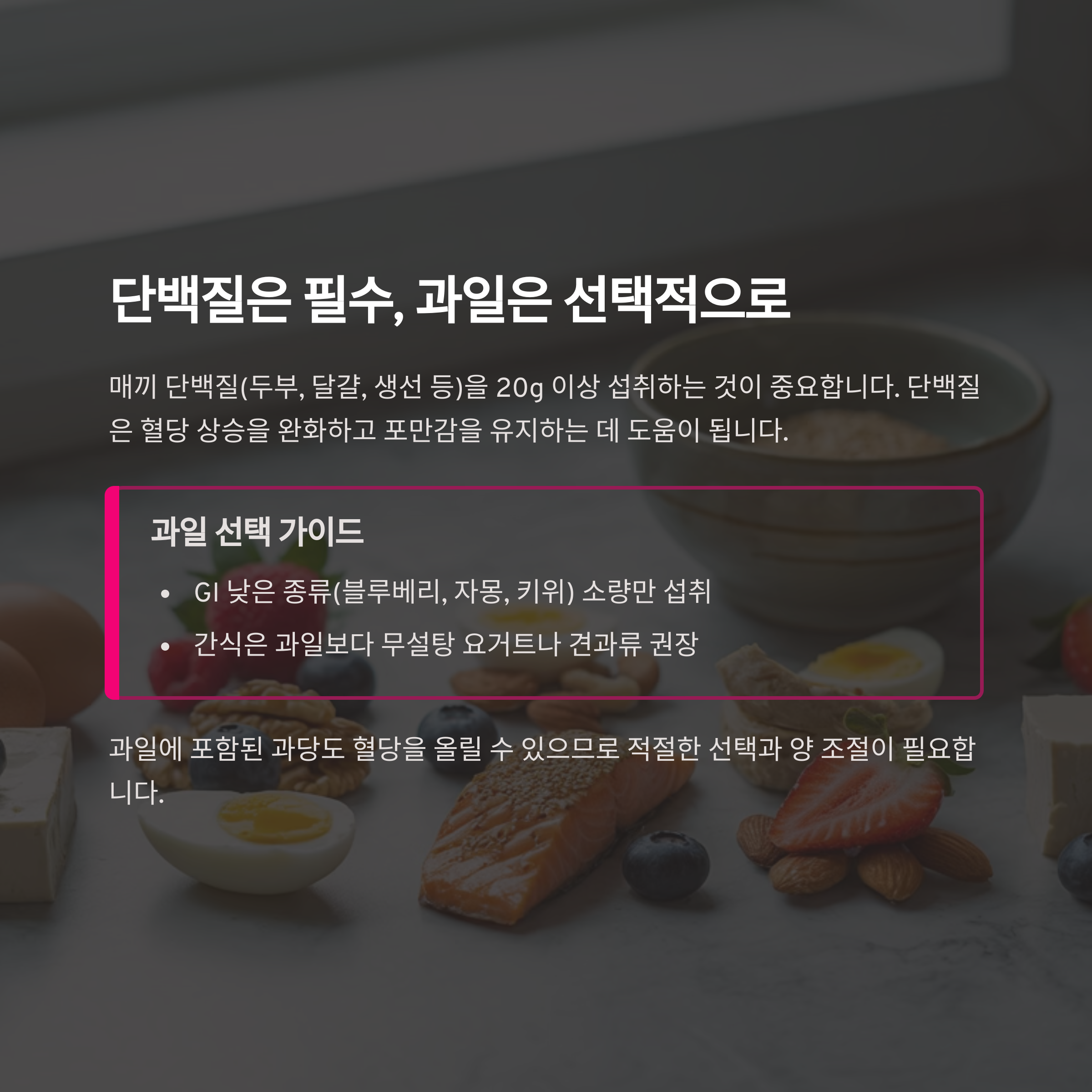 ▶ 실천 팁: 간식은 과일보다 무설탕 요거트나 견과류 권장