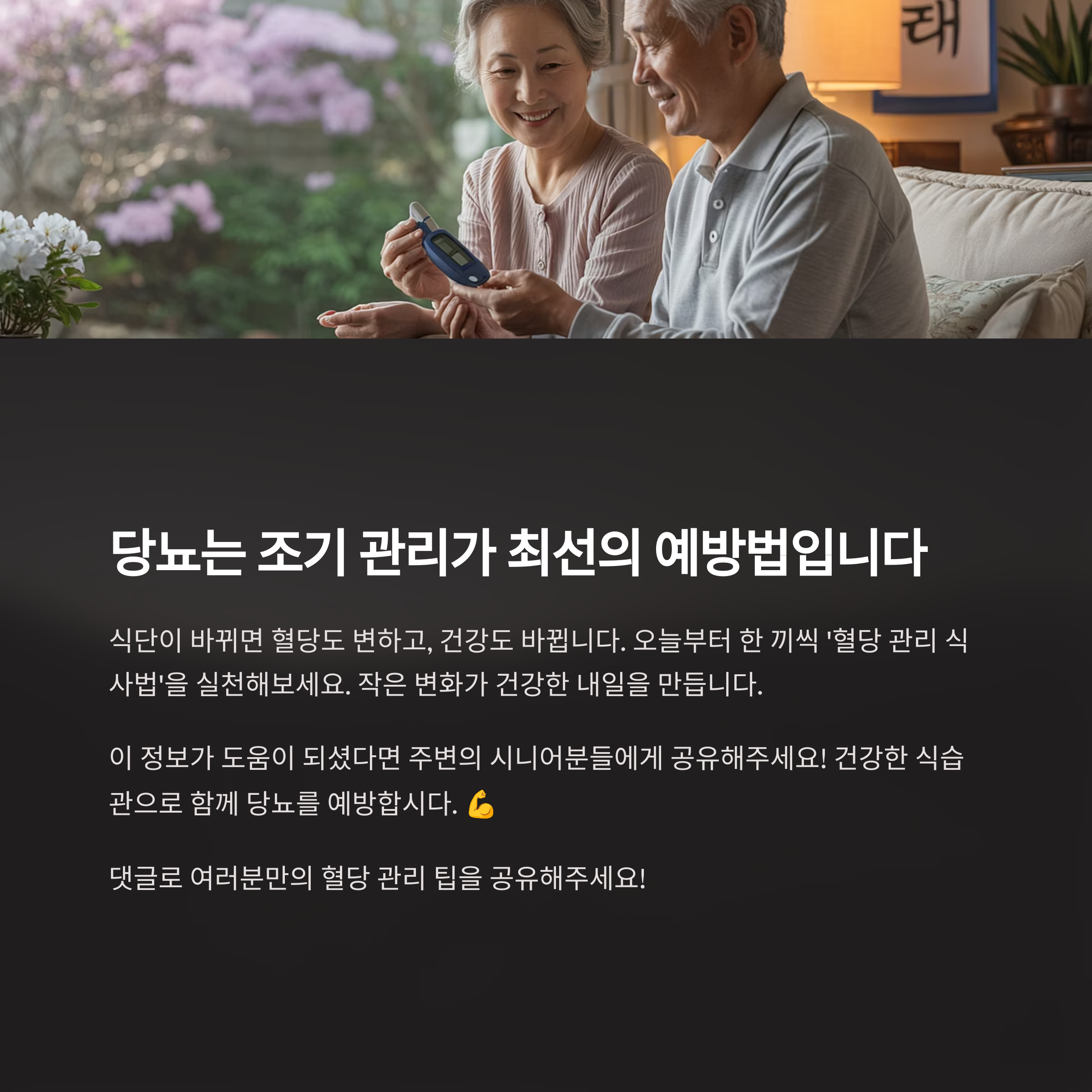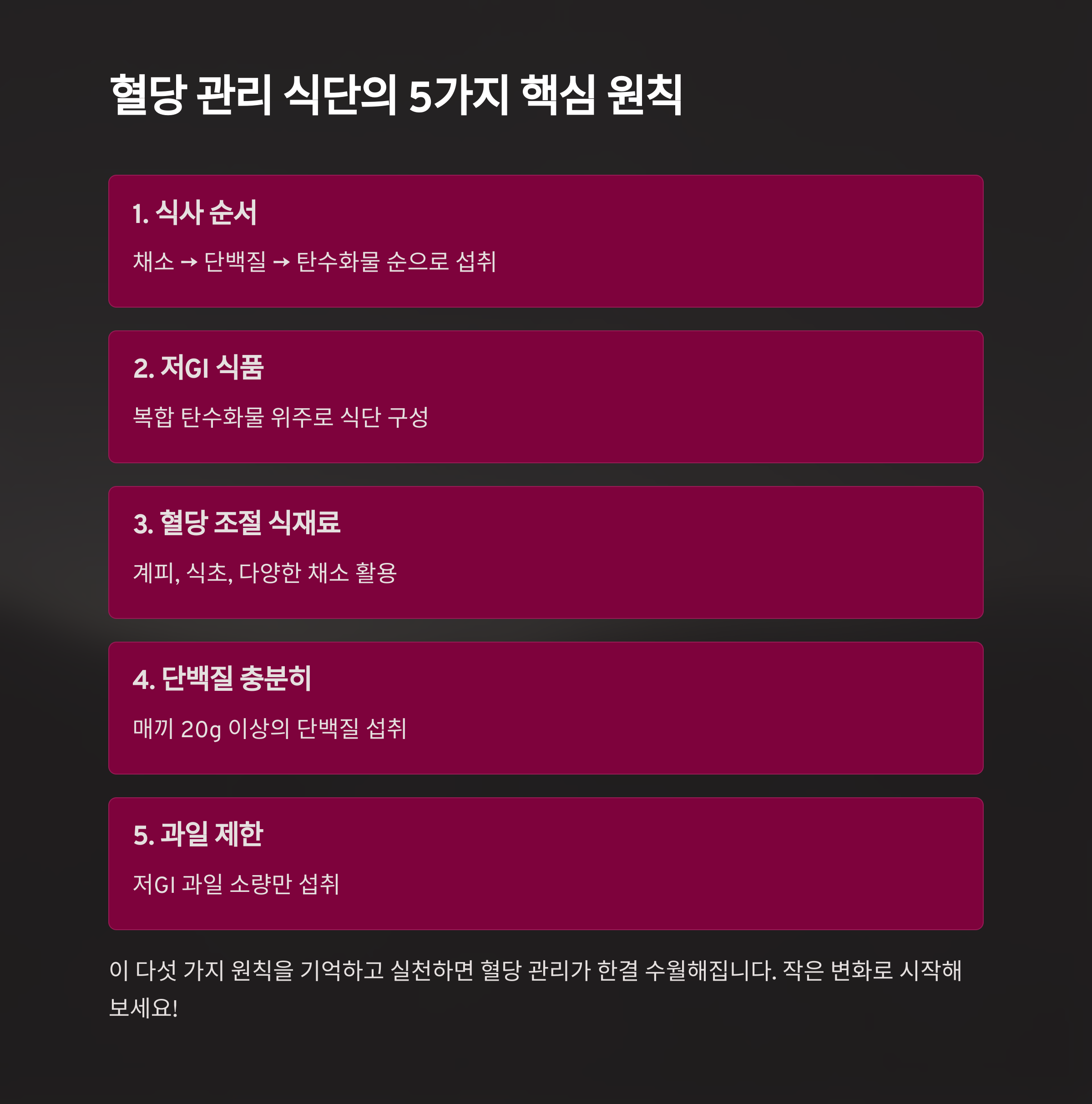 당뇨는 조기 관리가 최선의 예방법입니다. 식단이 바뀌면 혈당도 변하고, 건강도 바뀝니다. 오늘부터 한 끼씩 ‘혈당 관리 식사법’을 실천해보세요. 작은 변화가 건강한 내일을 만듭니다.