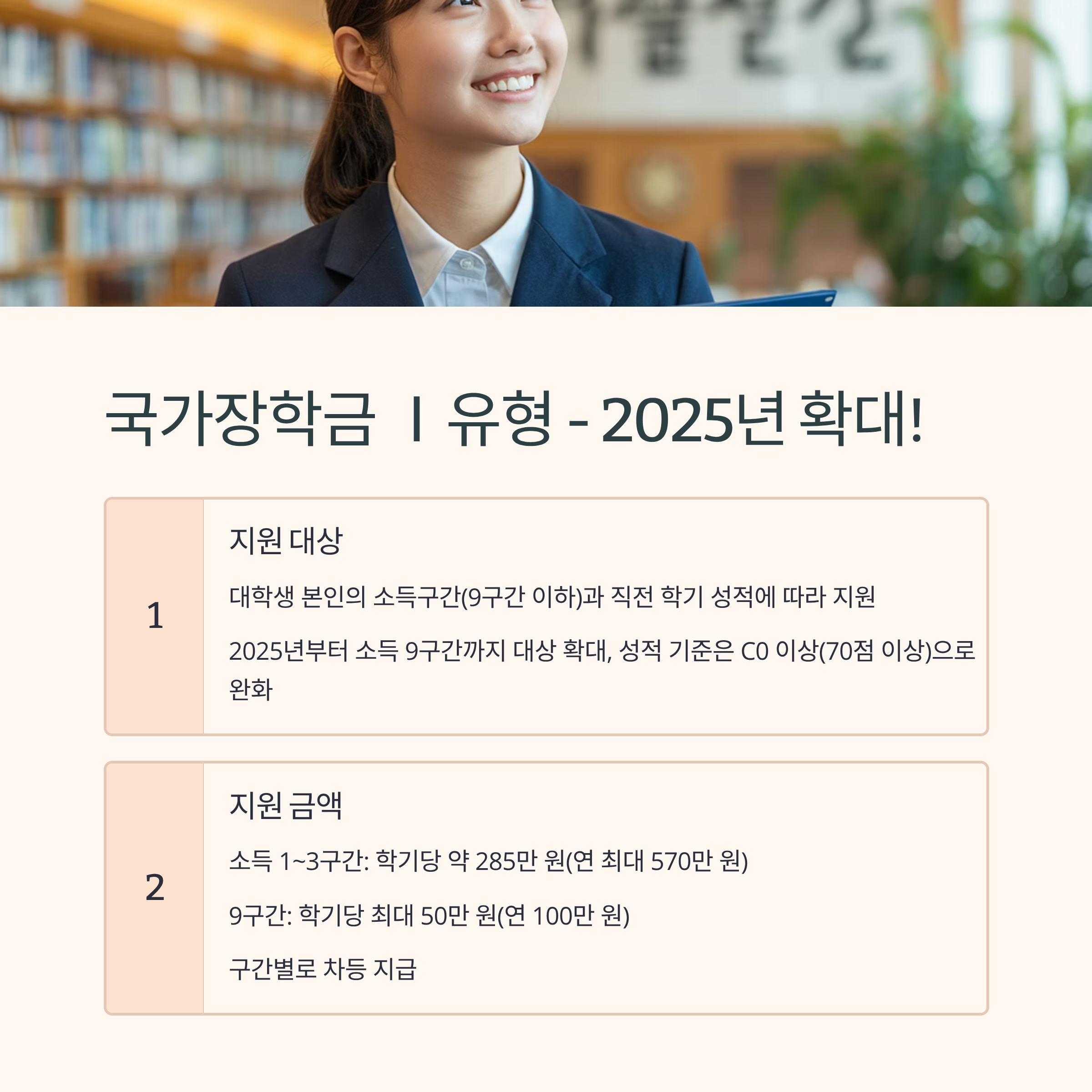 • **Ⅰ유형(학생직접지원형)**은 대학생 본인의 소득구간(9구간 이하)과 직전 학기 성적에 따라 등록금 일부 또는 전액을 지원하는 국가 장학금입니다. 2025년부터는 소득 9구간까지 대상 확대, 성적 기준은 C0 이상(70점 이상)으로 완화되었습니다 (청년 지원 정책 알아보기).