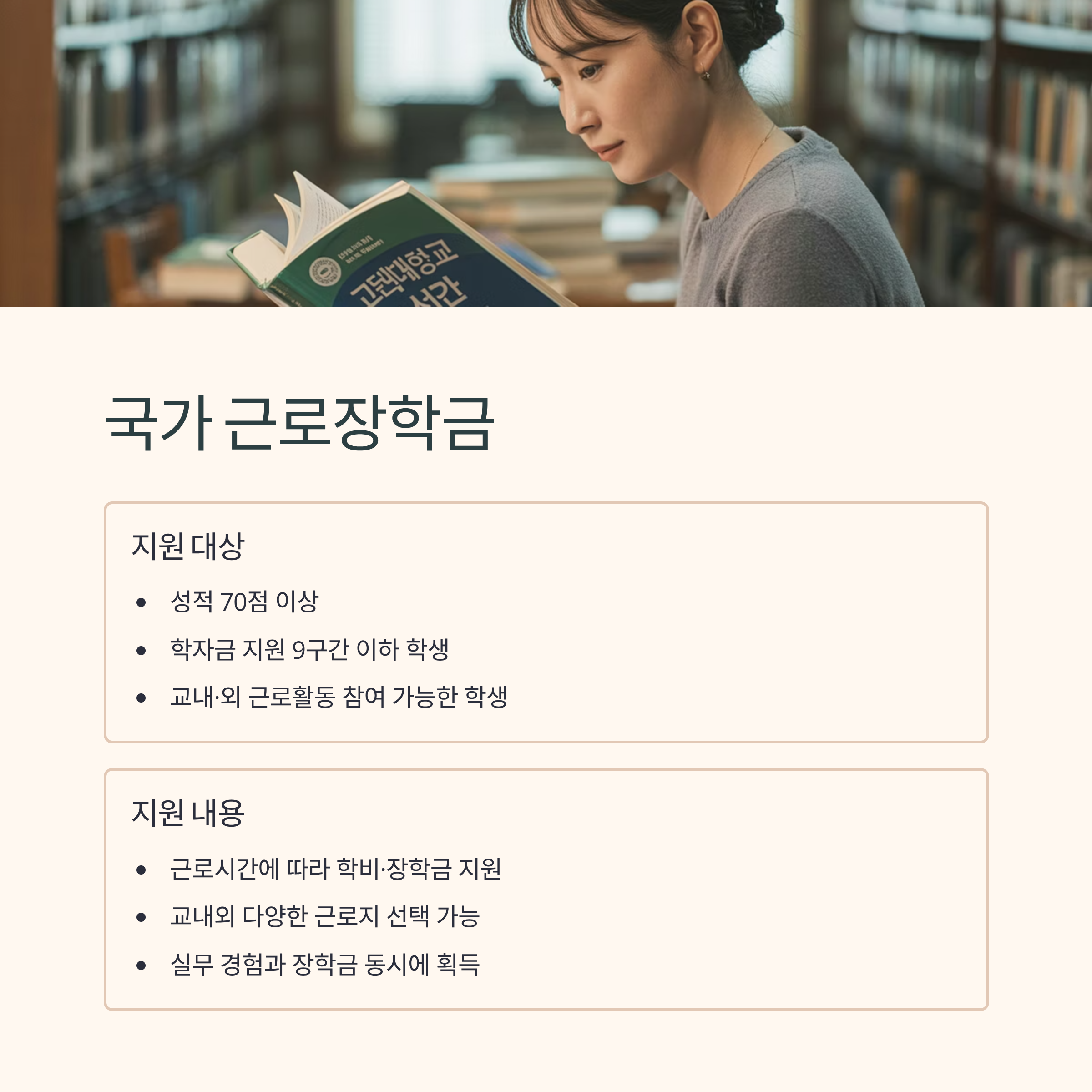 | 근로장학금 | 성적 ≥70점, 학자금 지원 9구간 이하 | 근로 시간에 따라 학비 지원 | 대학 또는 한국장학재단 신청 |