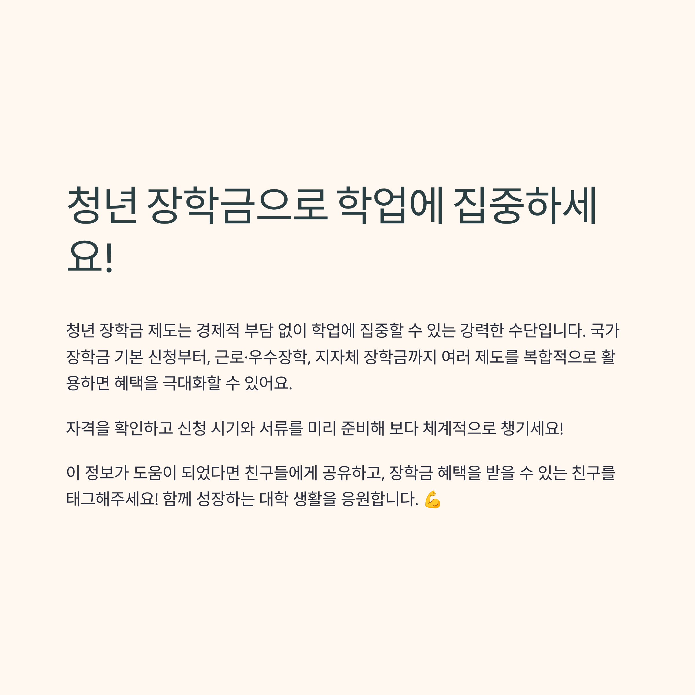 청년 장학금 제도는 경제적 부담 없이 학업에 집중할 수 있는 강력한 수단입니다.