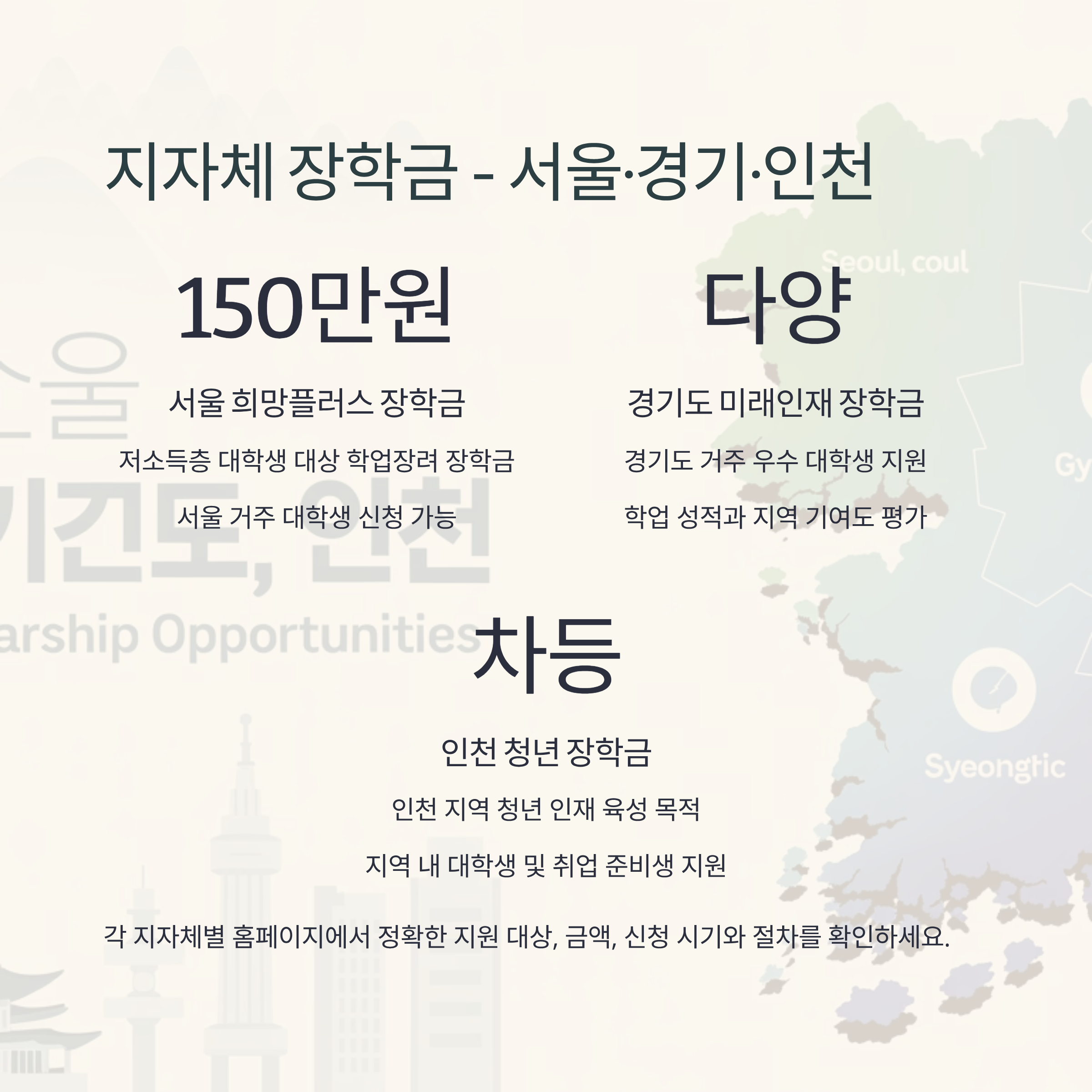 - 지자체 장학금은 서울, 경기, 인천 등 각 시도별로 운영되며, 등록금 및 생활비, 멘토링, 취업 연계 프로그램 등을 포함. 예: 서울의 ‘희망플러스 장학금’은 저소득층 대학생에게 최대 150만 원 지급하는 학업장려 장학금입니다 (청년 지원 정책 알아보기).
