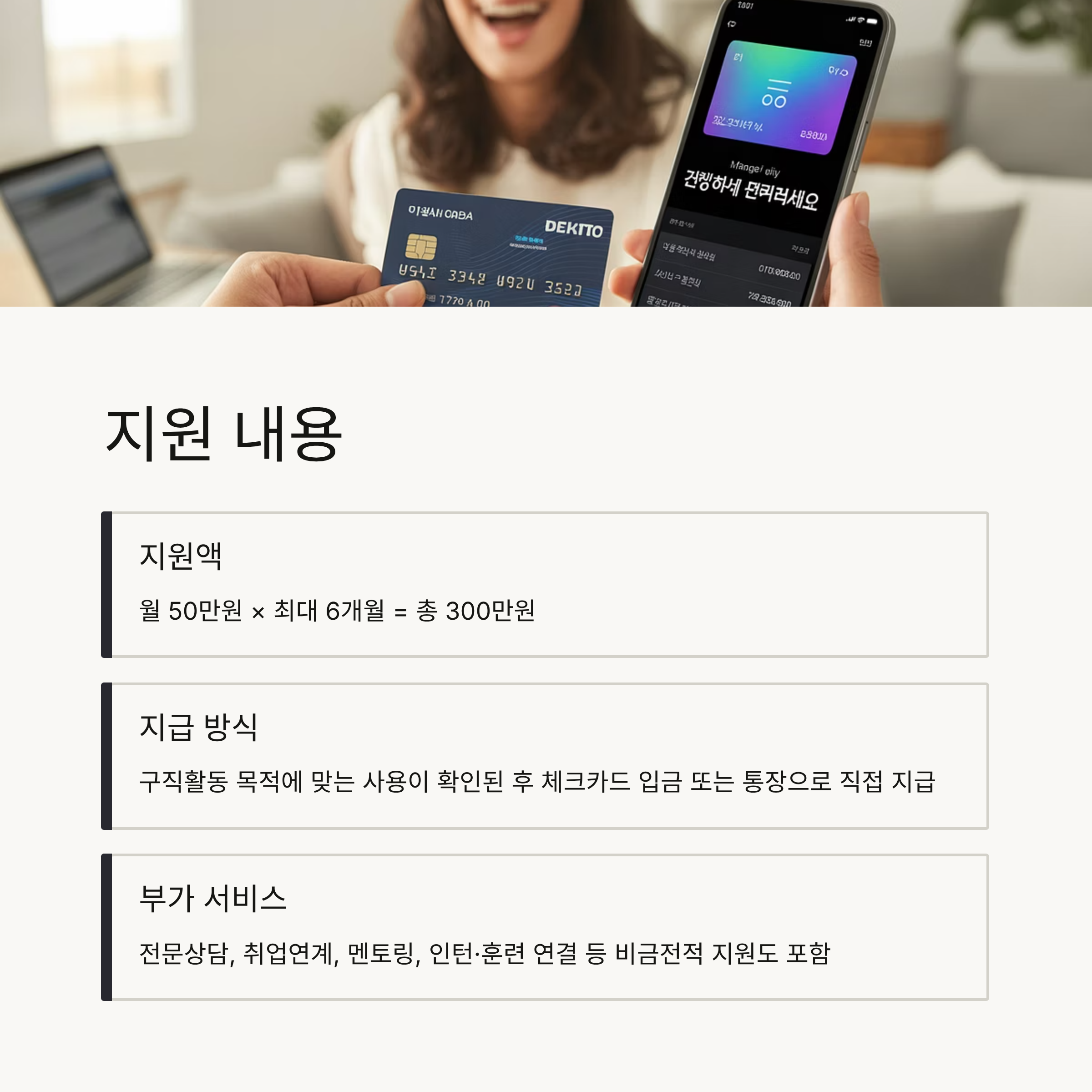 - 지원액: 월 50만원 × 최대 6개월 = 총 300만원
