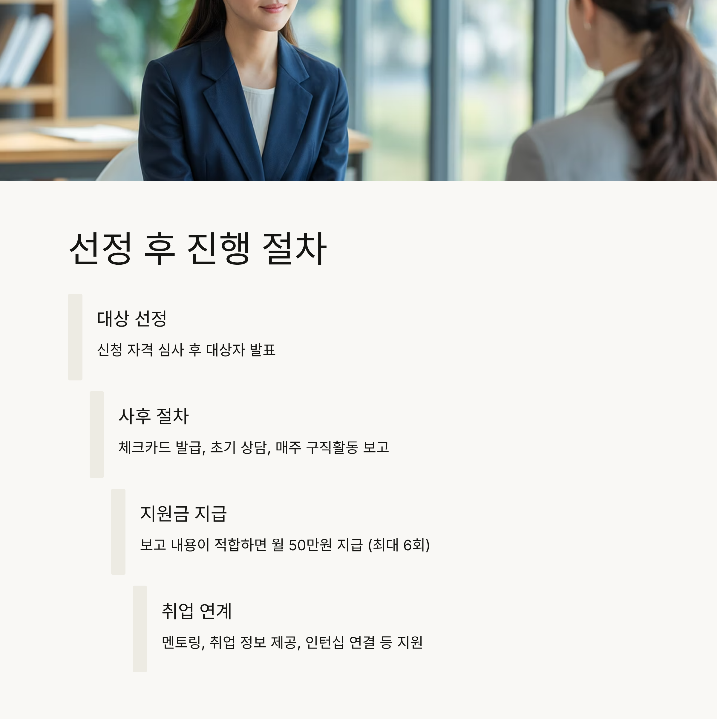- 사후 절차: 체크카드 발급, 초기 상담, 매주 구직활동 보고