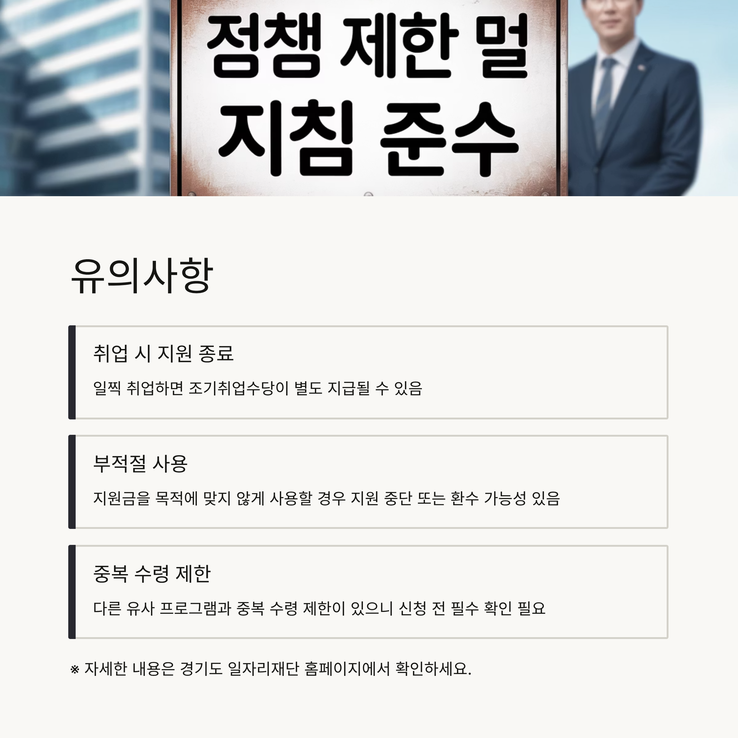 - 취업 시 지원 종료: 일찍 취업하면 조기취업수당이 별도 지급될 수 있음